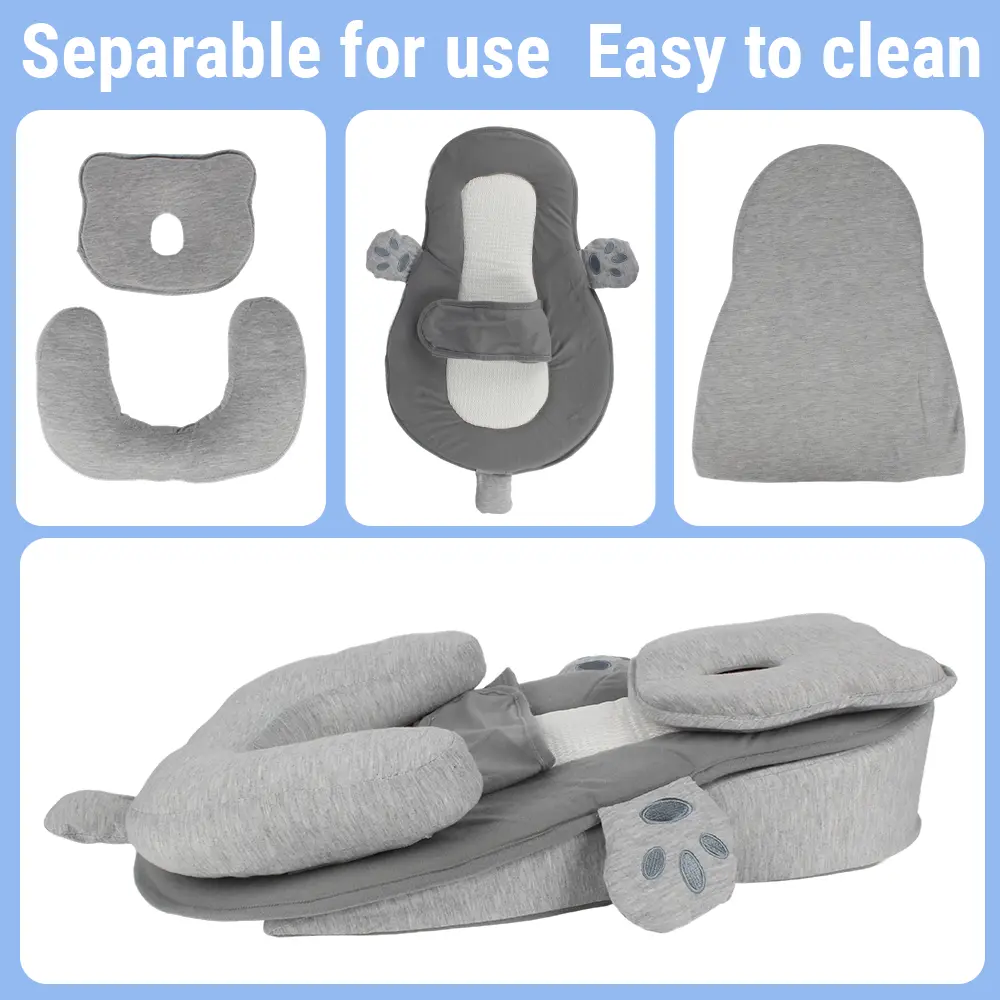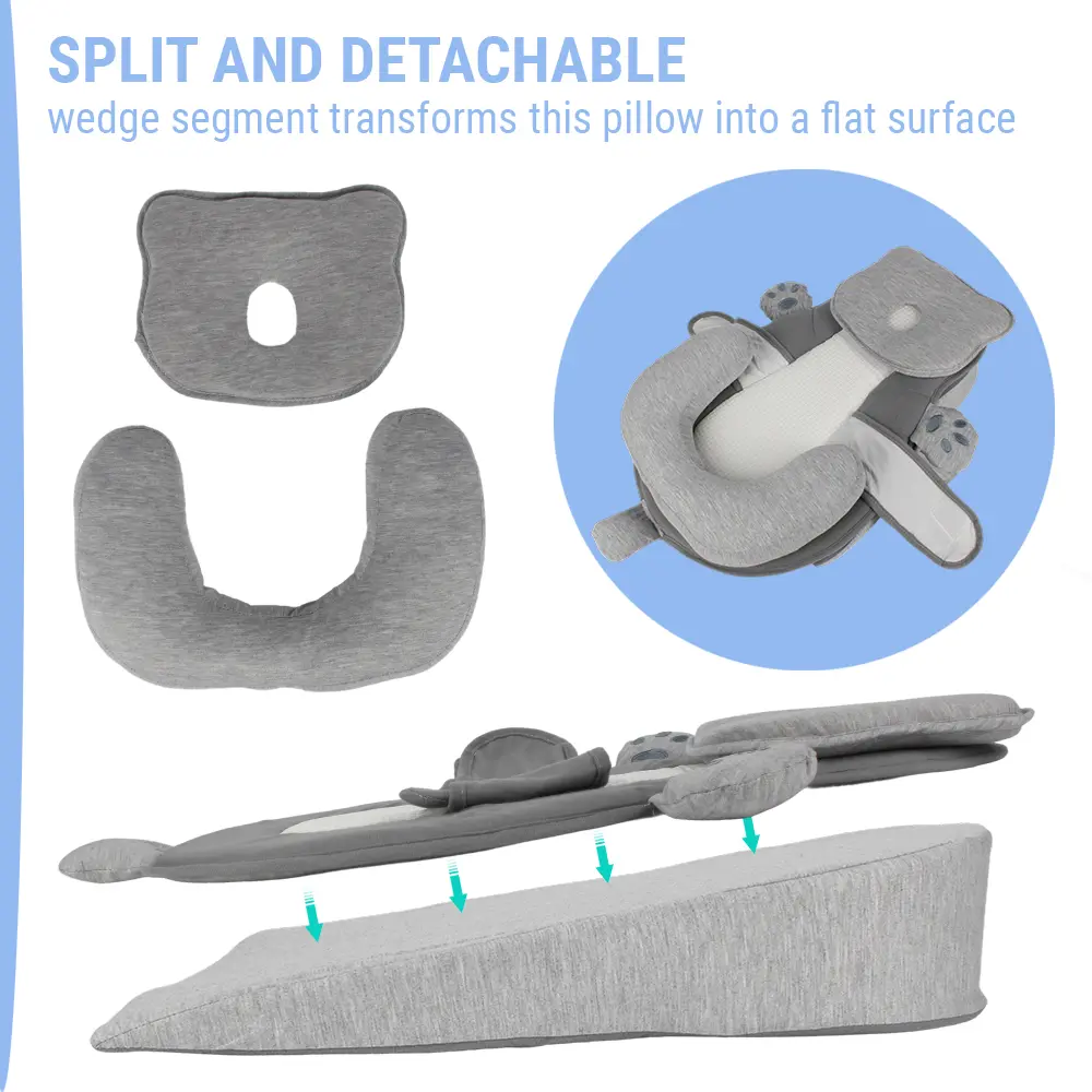 This grey baby feeding pillow is specially designed to reduce spit-up and reflux, keeping your baby’s airway open and breathing smoothly during feeding and resting.