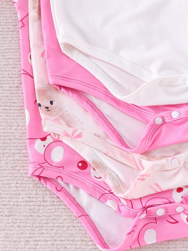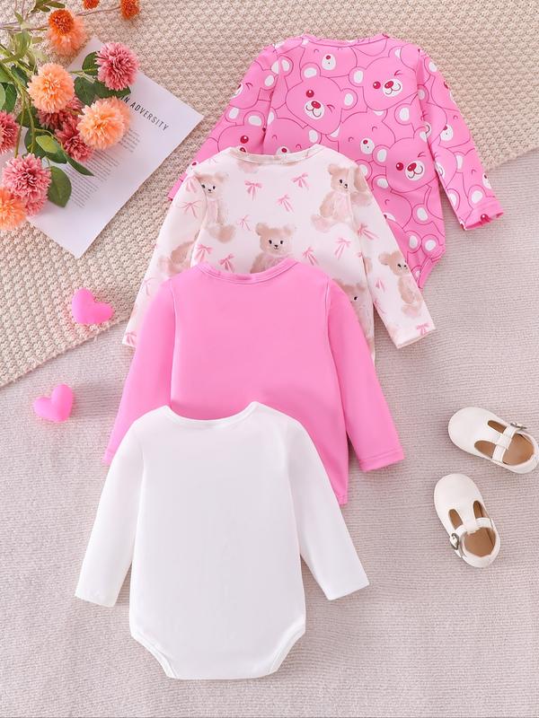 5. Baby Girls' Soft Comfortable Cartoon Bear & Bow Print Long Sleeve Onesies Set, Cute Sweet Fitted Above the Knee, 4 Pieces Baby Clothes Girl Spring Summer Fall Winter