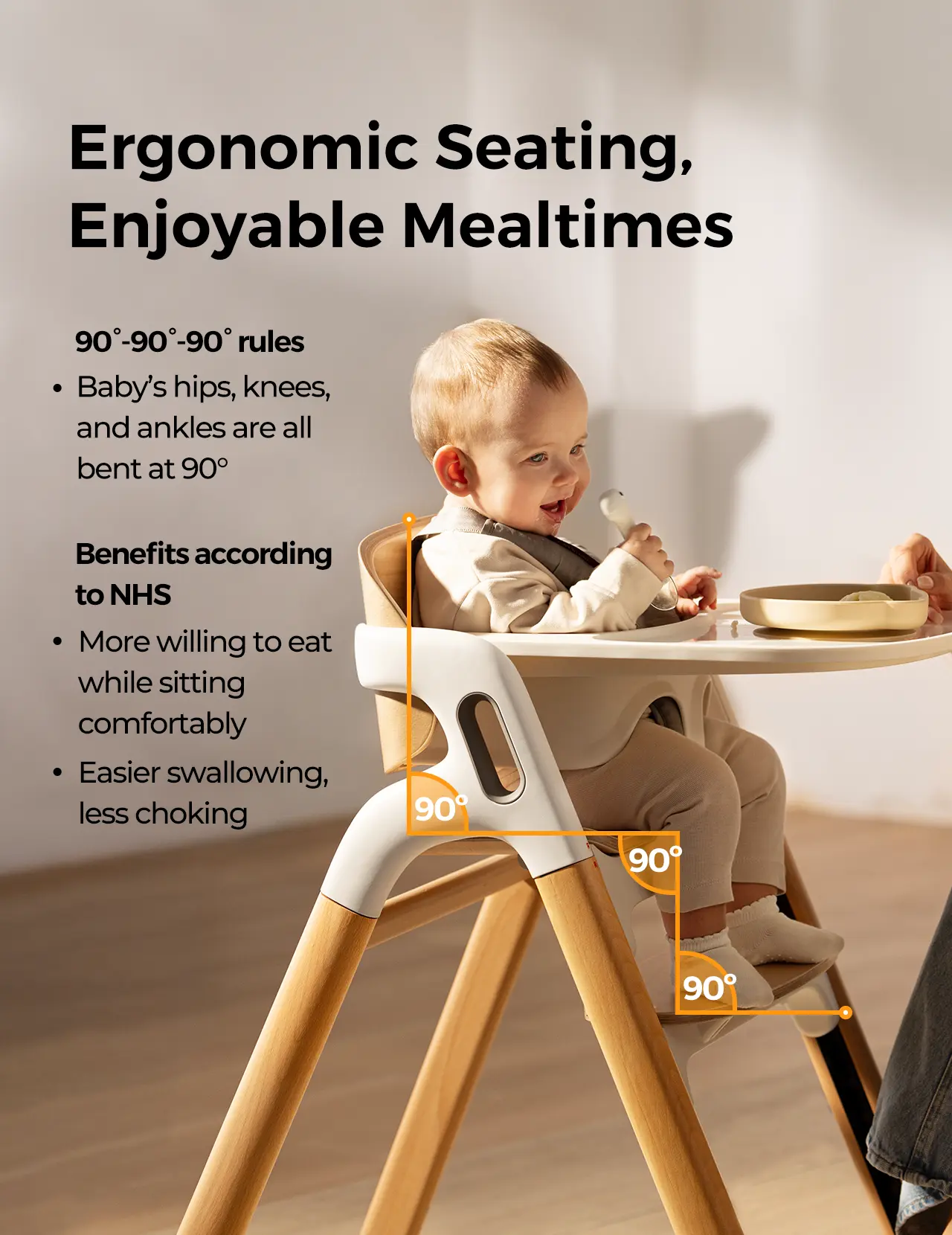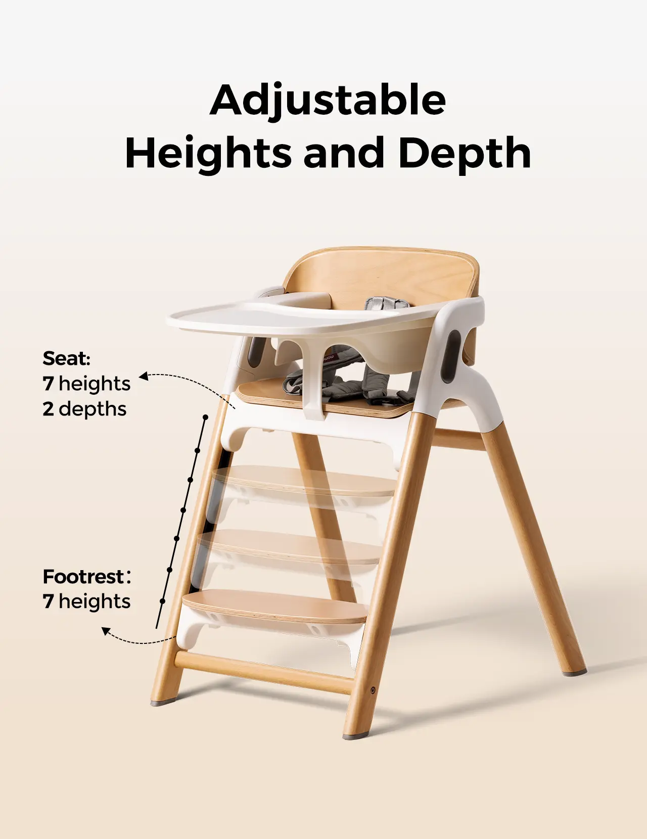 Ergonomic Posture Support - Backrest: Slightly curved backrest promotes natural spinal alignment during feeding. - Seat Depth: Adjustable seat depth (2 positions). - Footrest: 7-level footrest supports 90-degree knee angles for stable sitting and standing. - Non-Slip Feet: Non-slip silicone feet enhance stability during active movements.