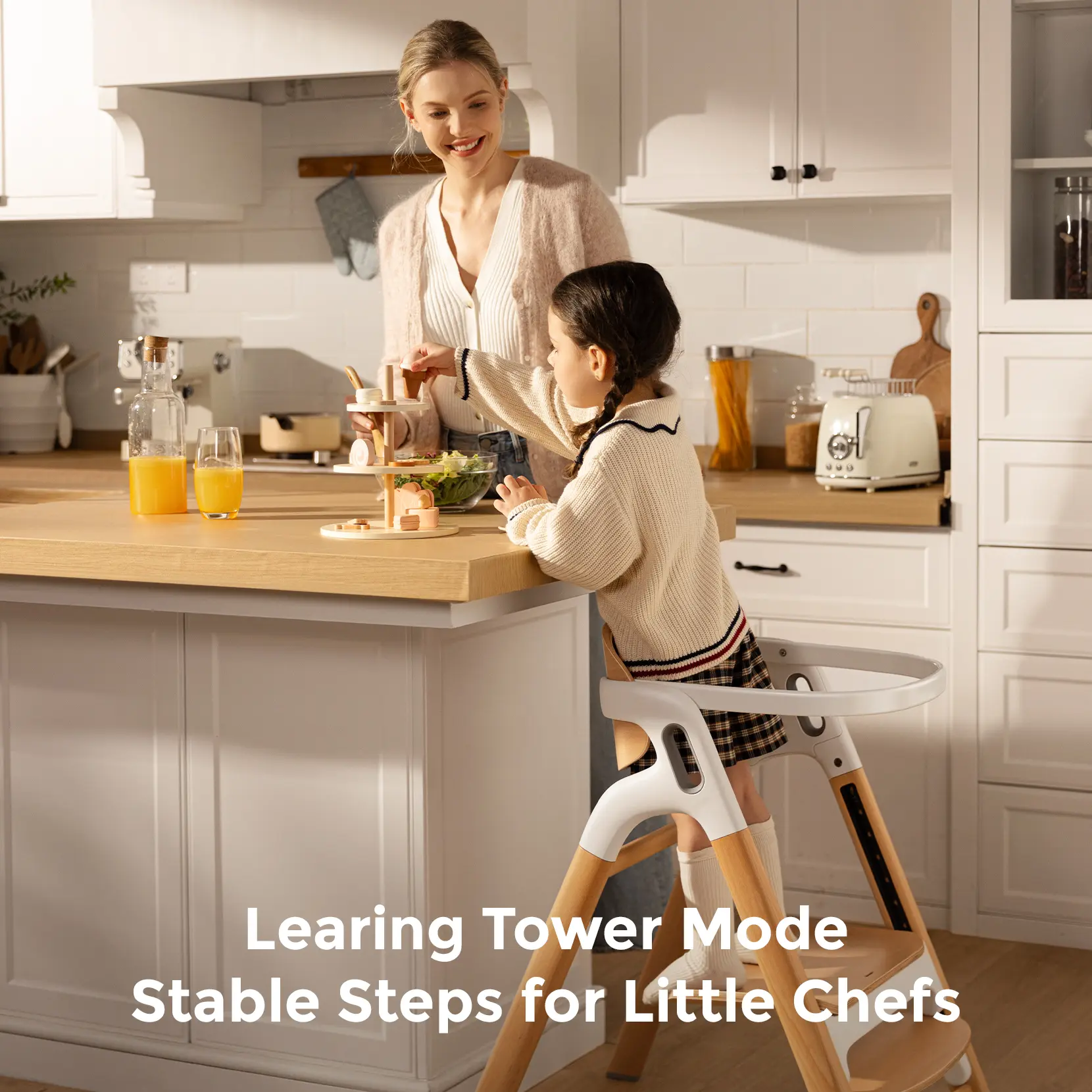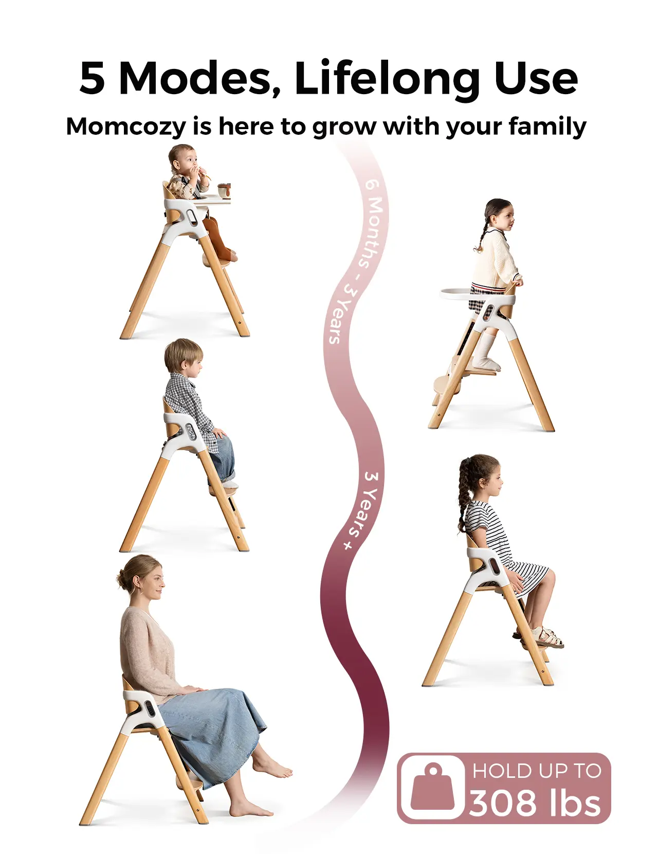 5-in-1 High Chair for Lifelong Use - Conversion: Effortlessly switches between a baby chair, learning tower, step stool, child chair, and adult chair. - Seat Width: 16-inch-wide seat with two depth positions for lasting comfort. - Adjustments: No tools required for seat and footrest adjustments; simply press and slide (7 height positions). - Capacity: Supports from 6 months+ to adulthood (308 lb capacity). - Evolving Needs: Seamlessly adapts to your family's evolving needs.