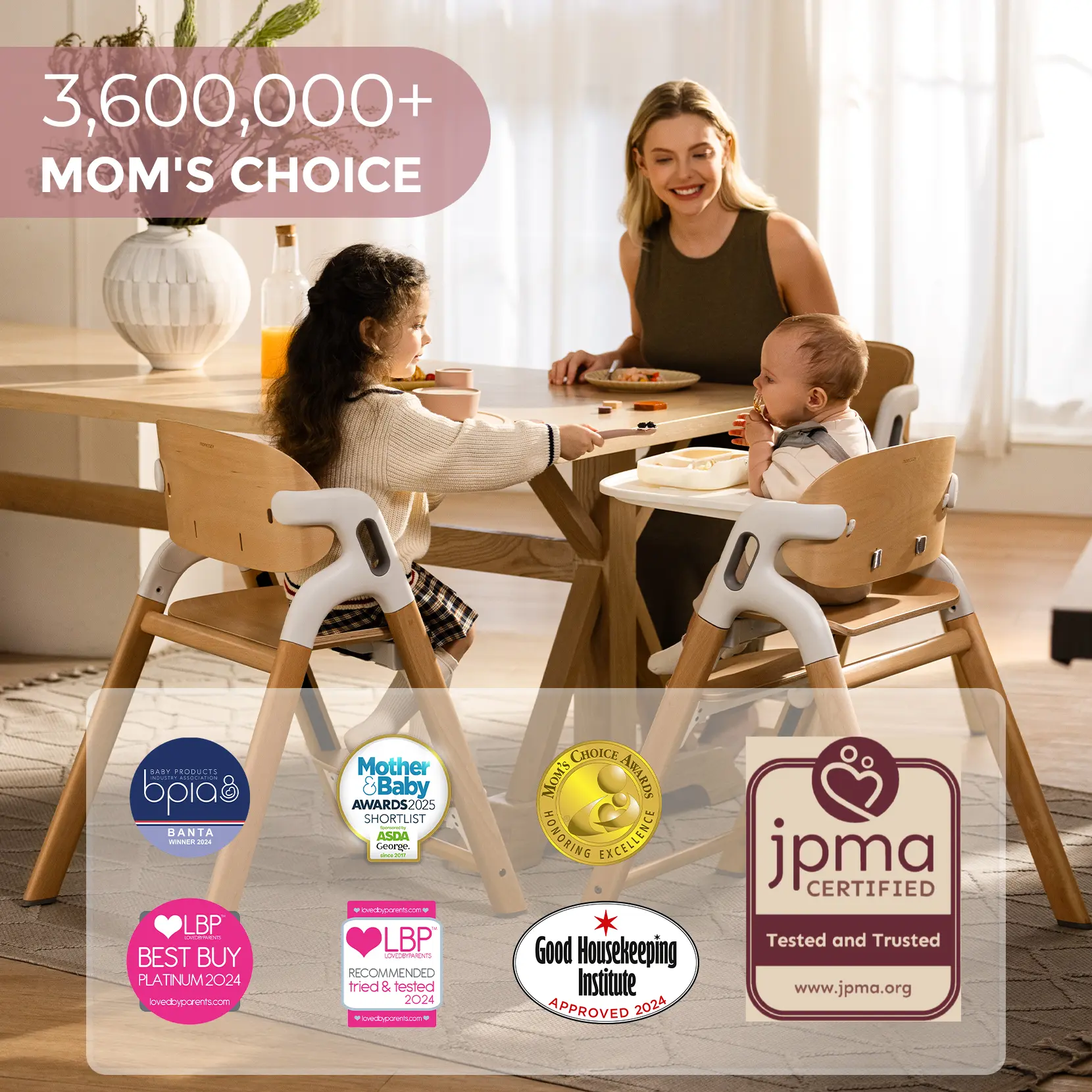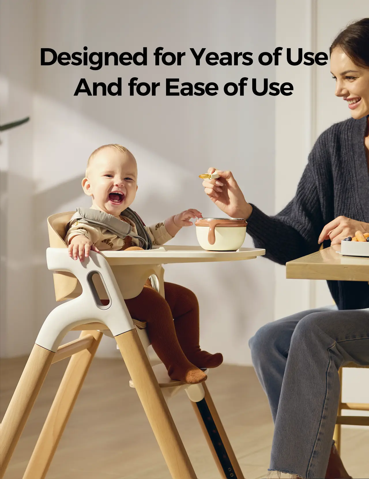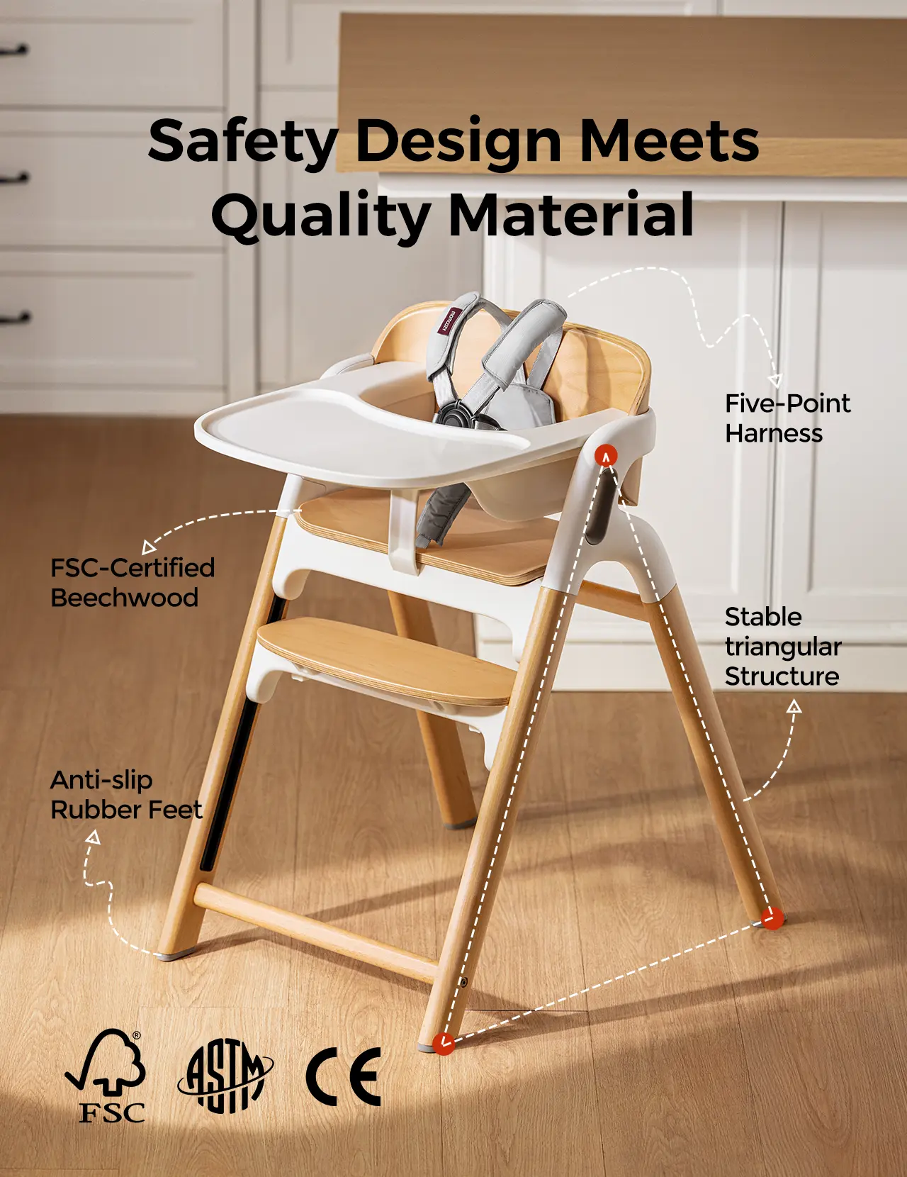 Safety First, Comfort Always - Harness: Larger, softer five-point harness keeps babies securely positioned. - Shoulder Support: Enhanced shoulder support design significantly reduces shoulder strain. - Frame: Stable triangular frame and non-slip silicone feet prevent tipping or sliding. - Material: Made of FSC-certified splinter-free beechwood. - Safety Standards: Rigorously tested according to global safety standards ASTM (US) & EN (EU).