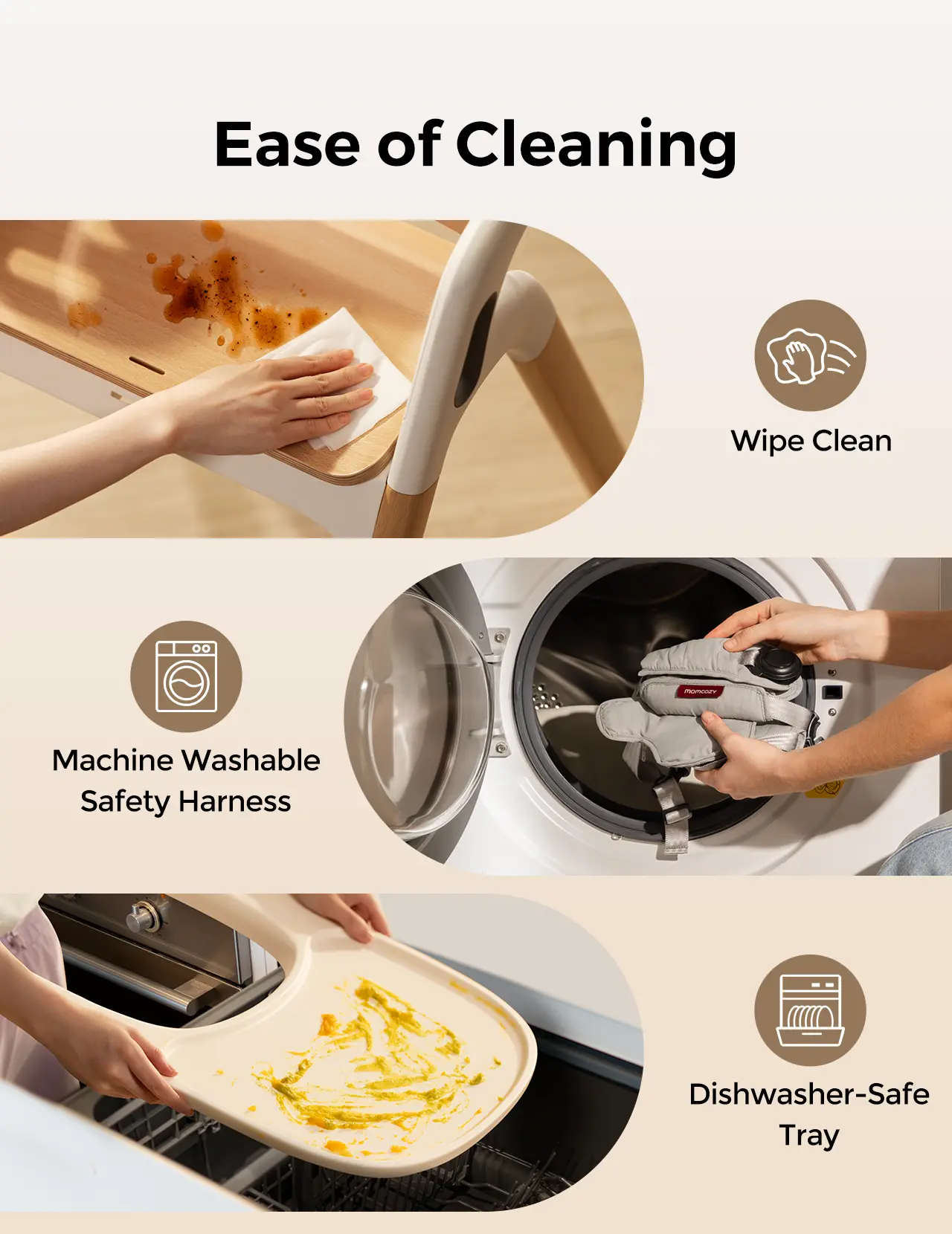 Cleaning Made Easy - Wipeable Surface: Enables quick removal of spills with a damp cloth. - Tray: Rinses quickly and is dishwasher-safe. - Harness: Detachable five-point harness is machine washable.