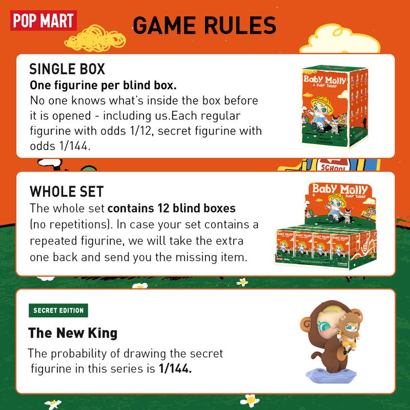 ·Blind Box: All items are figurine products with different designs. Each box contains one random design for value of 19.99 USD, and comes in a sealed box with no one knows what's inside-including us. This whole collection contains 12 regular figurine products (Odds: 1/12), and 1 secret edition(Odds:1/144).