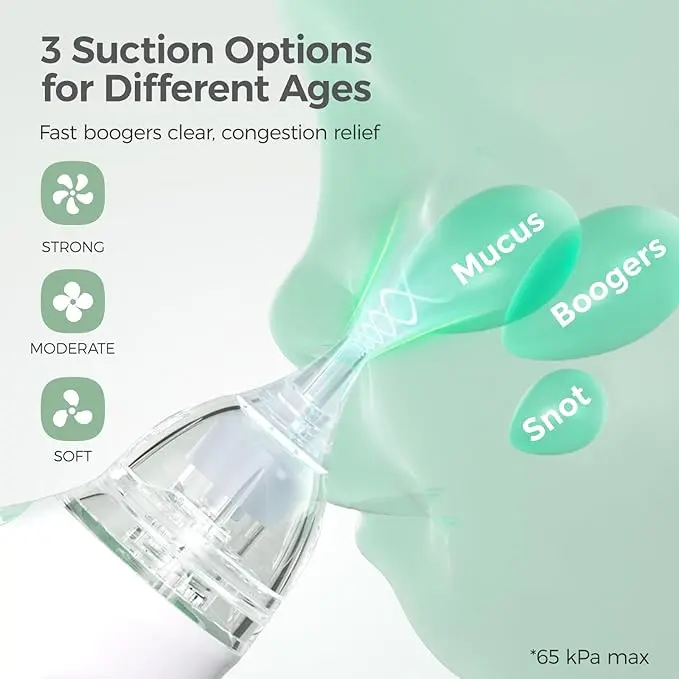 ·【All the Stuff Cleaned with One Suction】Momcozy nasal aspirator for baby, 3 levels of suction power for different situations of boogers cleaning, with maximum suction power to ensure one suction for cleaning baby's boogers and snot.