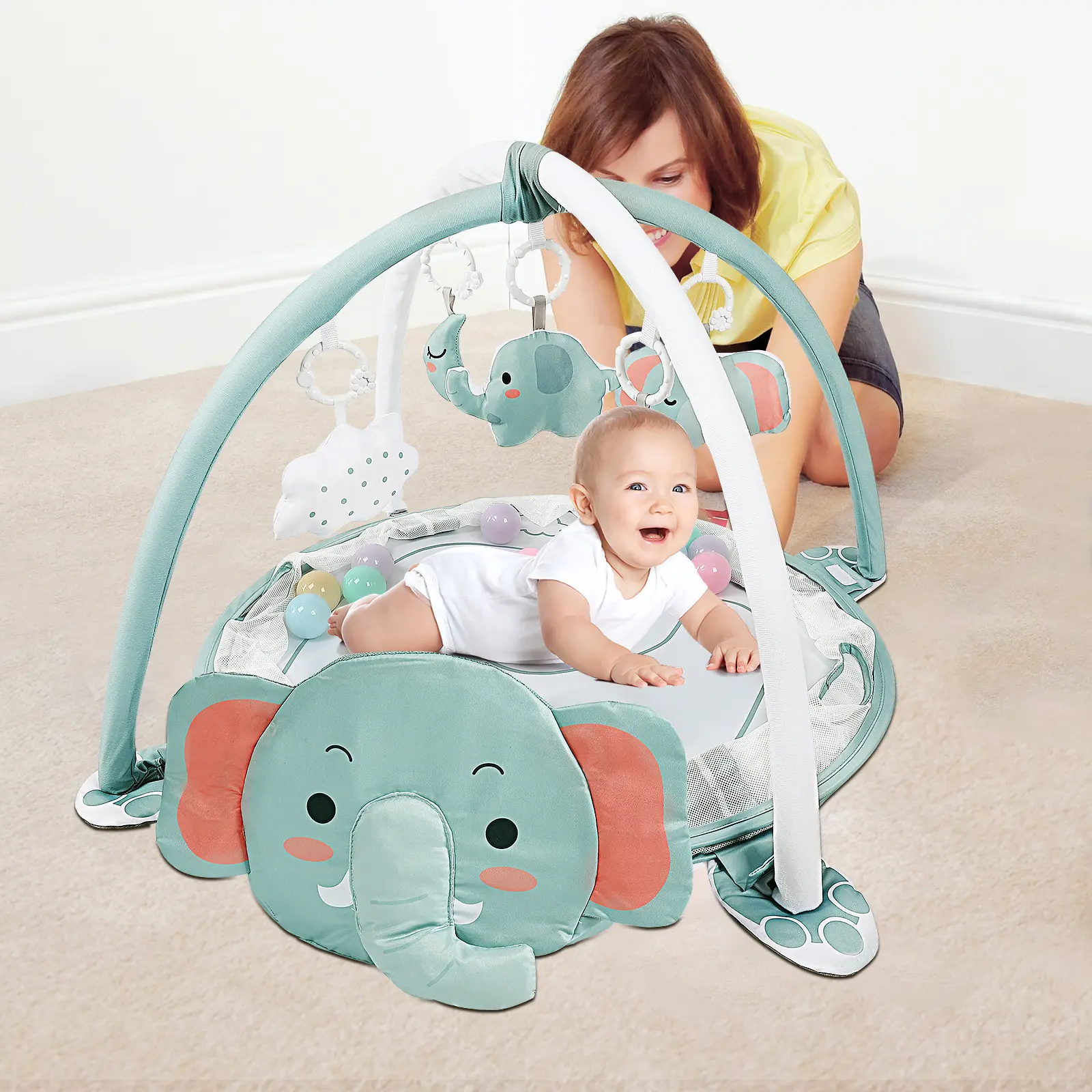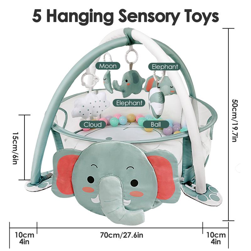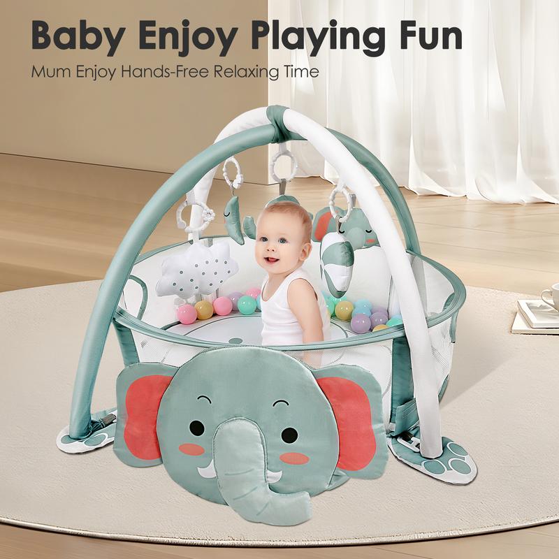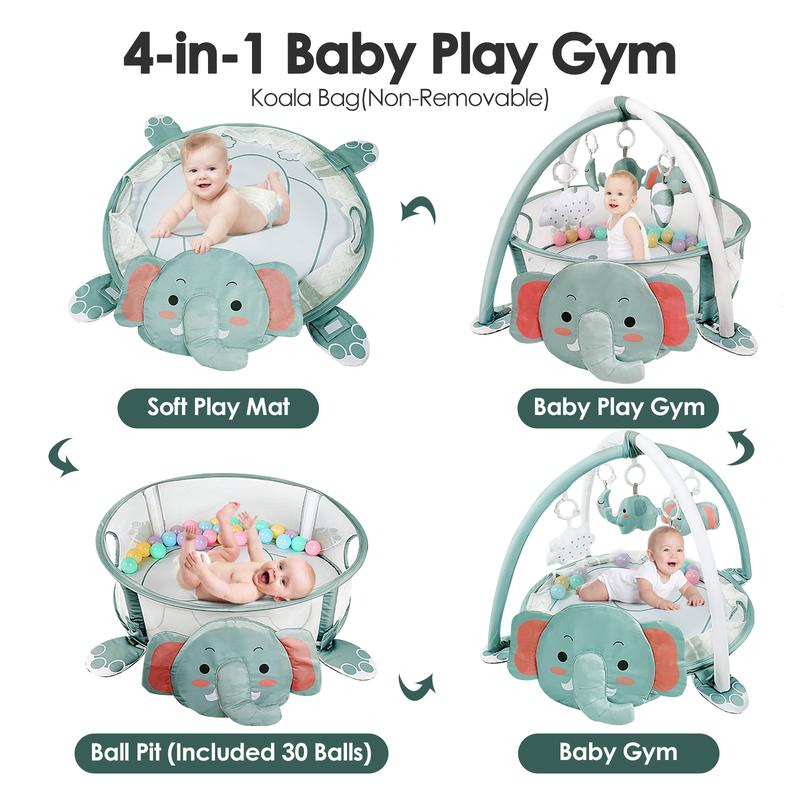 The Dearlomum 4-in-1 Baby Play Mat is perfect for newborns and toddlers. It features an elephant gym and tummy time mat. Ideal for floor activities, it includes 30 balls and 5 sensory toys. Suitable for both boys and girls, it's a great gift. 🎁