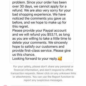 After a 3star review with a rip in the product they finally sent me another one that one ripped too!! Requested a refund which they couldn’t do outside the 30day window but said they send to PayPal if delete my review. This is a bribe! Pics below