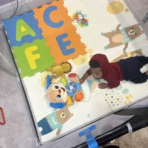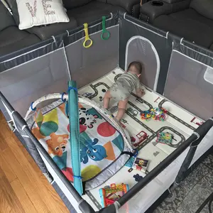 Got this for my 9mo. Plenty of space to play and crawl or walk around for baby. Room for mom to sit or lay but unless you get extra padding the non slip mat is pretty firm and not great for sleeping, but good enough to save baby from ouchies. Wish the mat would attach also because baby might lift.