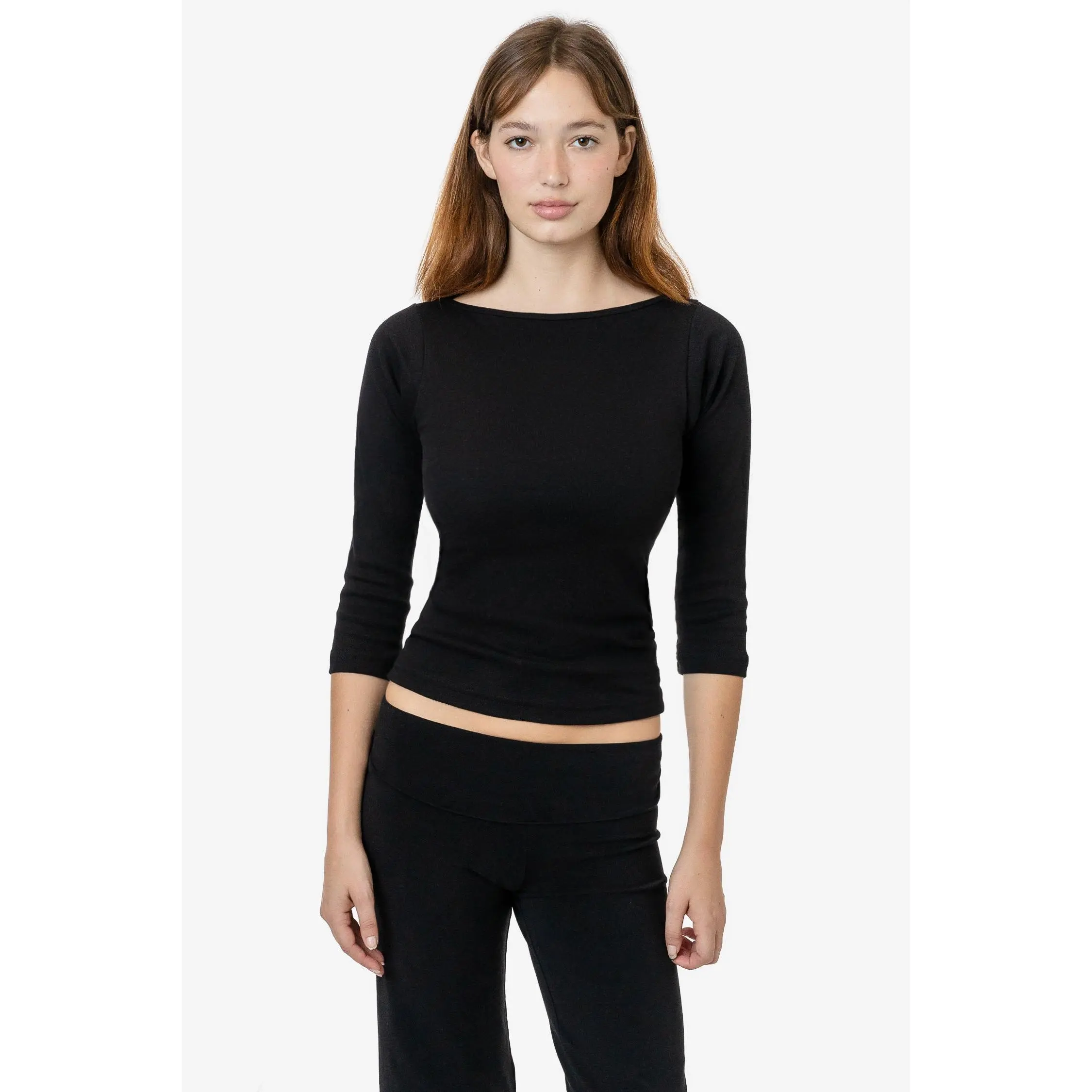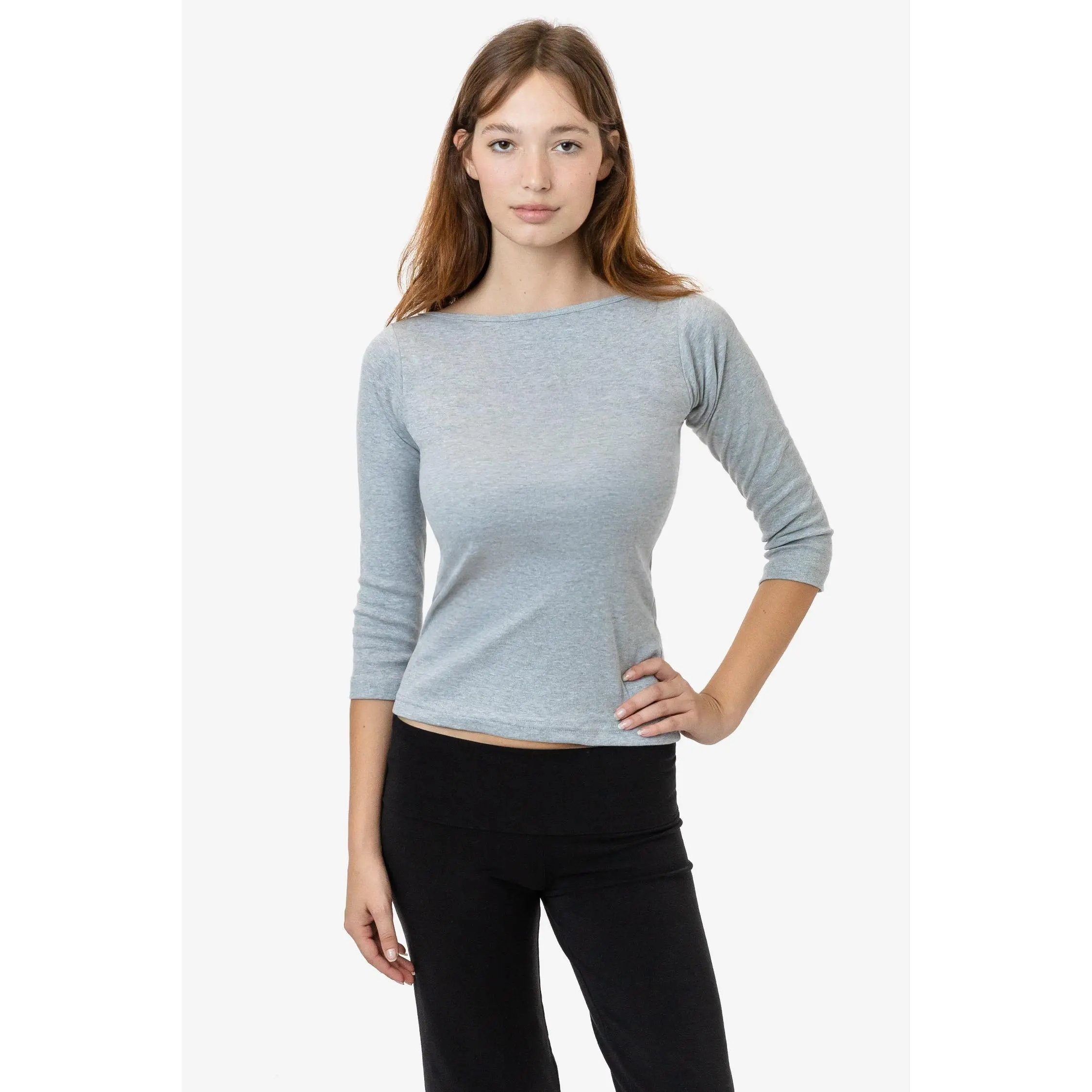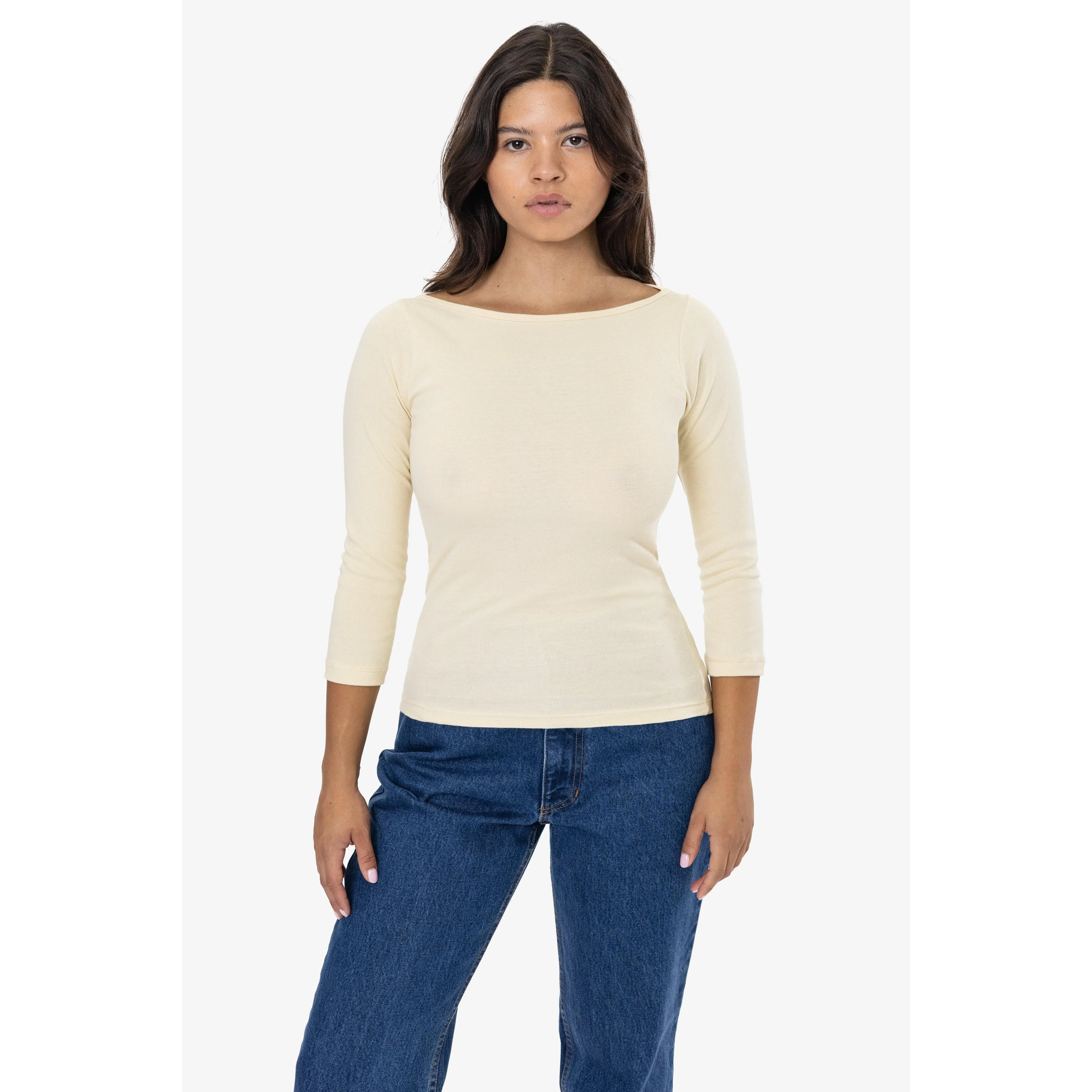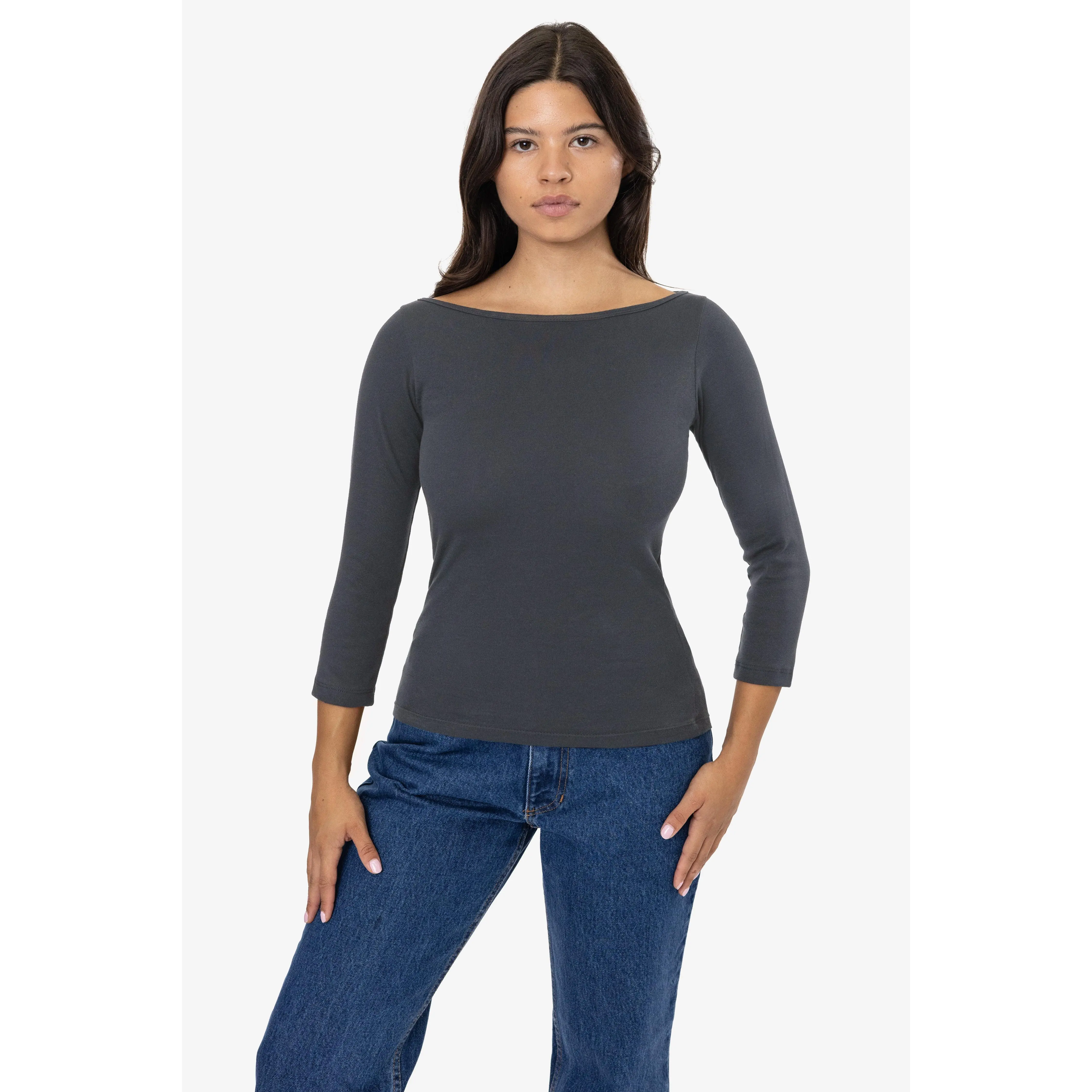 A chic and elegant boatneck top made of our combed cotton baby rib. This top has 3/4 length sleeves and a full length that can be paired with a variety of bottoms for year-round wear.Our baby rib is made of soft 30 singles yarn and stretches up to 2 times its original size. This 100% cotton style shrinks up to 7% in wash and this style has been designed to fit before and after wash. Made in Los Angeles, Calif. by workers earning fair wages.• Made in Los Angeles, Calif. • Baby Rib• 100% Combed Cotton• Heather Grey: 90% Cotton / 10% Polyester• 6.5 oz