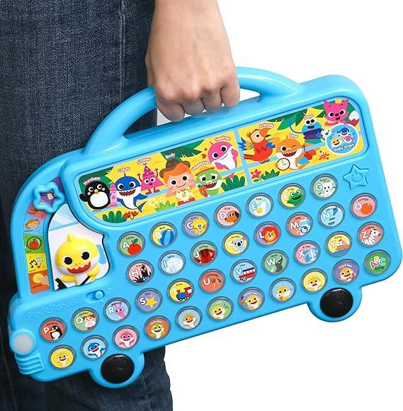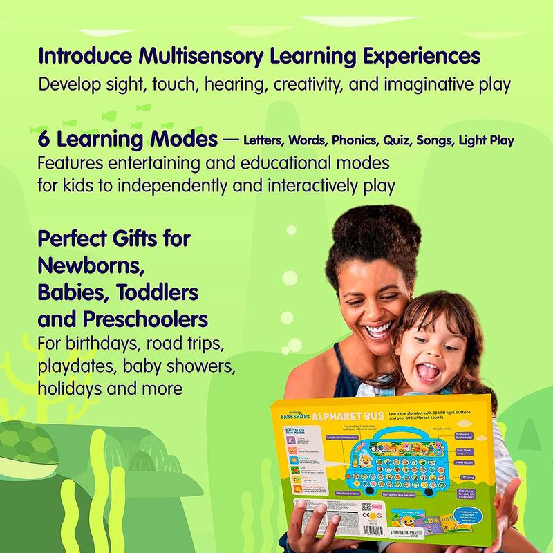 ·Baby Shark ABC learning toy that is shaped as a bus with the evergreen character, Baby Shark, as its driver! This content-heavy educational sound pad is perfect for children to enjoy Pinkfong's nursery rhymes and songs (including the iconic 'Baby Shark Dance' song), play with LED lights, engage in intuitive learning with quiz time, and many more. Perfect for babies, toddlers, and preschoolers who love Baby Shark and Pinkfong characters!