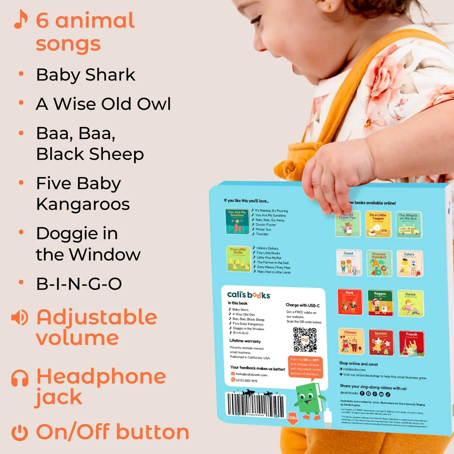 Inside the colorful hard cover, you’ll find 6 pages filled with lively illustrations and easy-to-follow lyrics contributed by various authors—all crafted to engage and entertain your little one. Created by a mom who knows the magic of combining learning with fun, this sound book is a proud product of a woman-owned, minority-certified business based in Los Angeles.