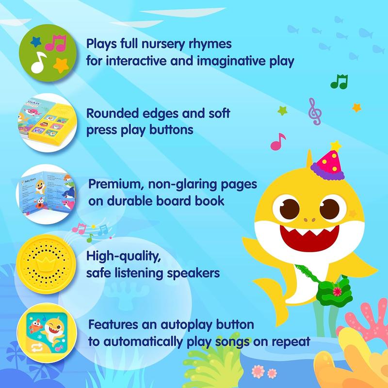 ·Baby Shark's favorite sing-along sound books are coming back in a mini edition, featuring an exciting new autoplay function! Playlist includes 'Baby Shark', 'Five Little Fish Jumping on the Kelp', 'Baby Mermaid Shark', and more from our popular YouTube channel with over 80 Million subscribers! Great for babies, toddlers, and preschoolers who love the acclaimed Baby Shark characters.