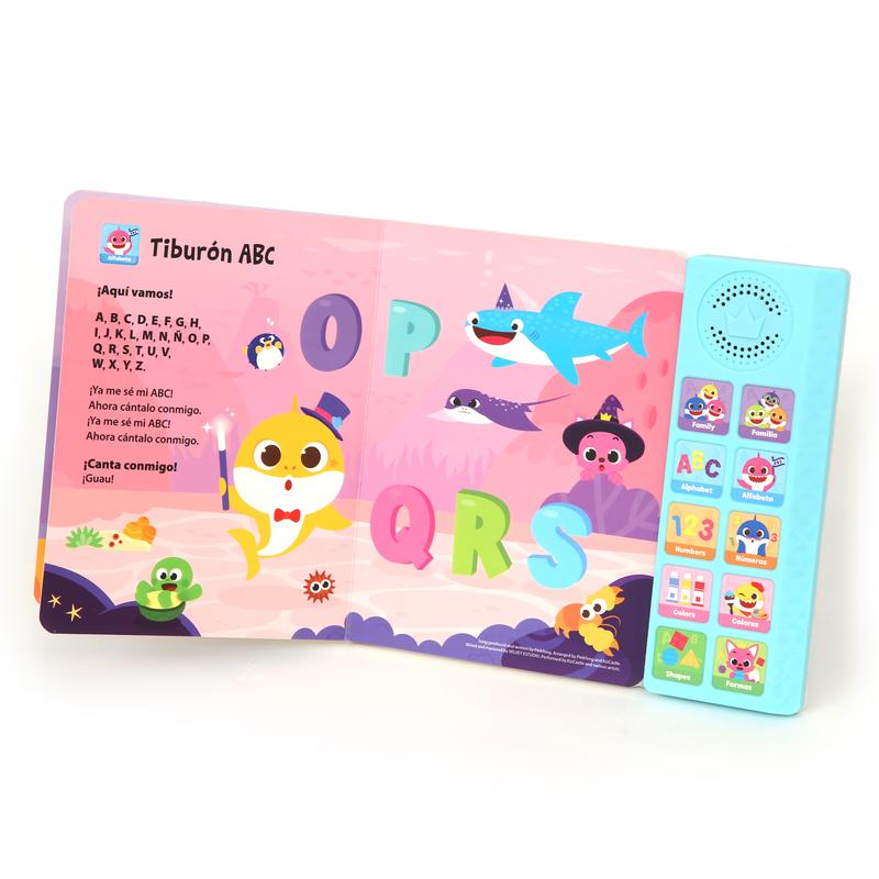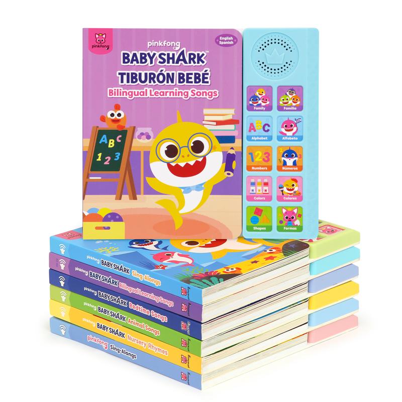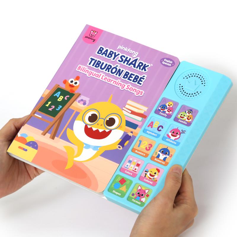 ·Official Pinkfong Baby Shark sound book that includes 10 press-play buttons with 16 colorfully illustrated pages on non-glaring, highly durable board book. 10 buttons play 10 full-singing children's songs to learn simple and familiar vocabulary words and themes. Educational book and interactive learning toy that helps toddlers and preschoolers learn English and Spanish languages through music. Designed to be child-friendly, this perfectly-sized board book is great for the little ones to read, sing, and play with.