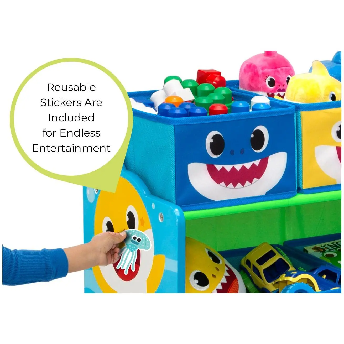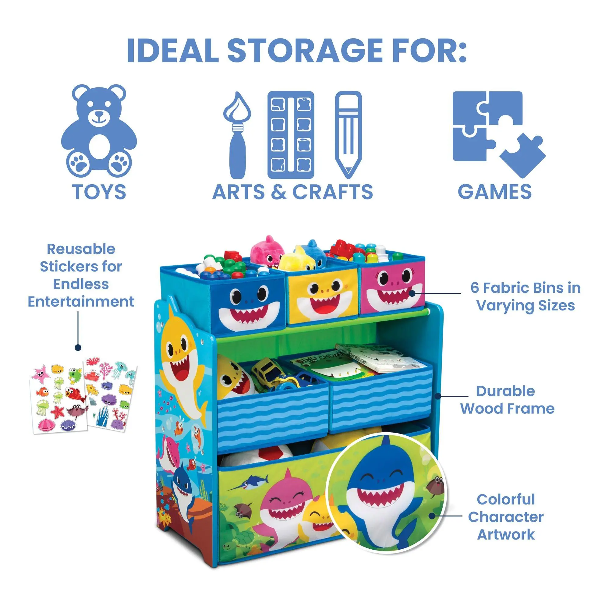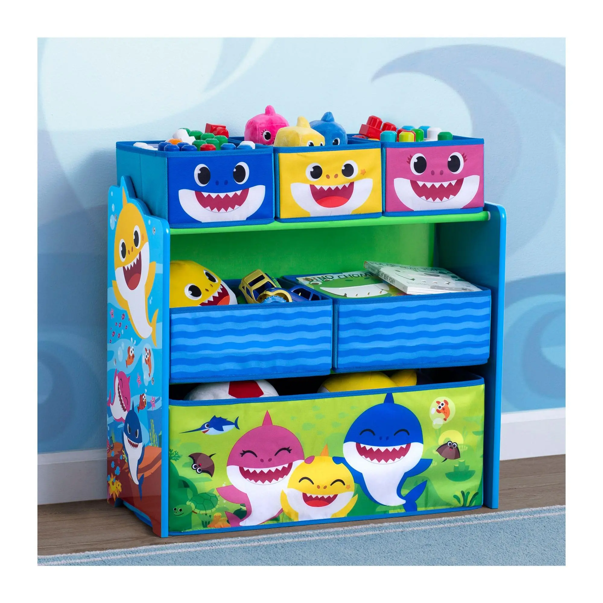 Your little one's playroom or bedroom will be clutter-less and as cute as can be with this Baby Shark storage organizer. Six fabric bins hold and hid toys, shoes, books, crafts, and so much more, all in a super-fun three-shelf organizer featuring colorful Baby Shark graphics. Plus reusable cling stickers let your child decorate to their delight over and over again. From Delta Children.