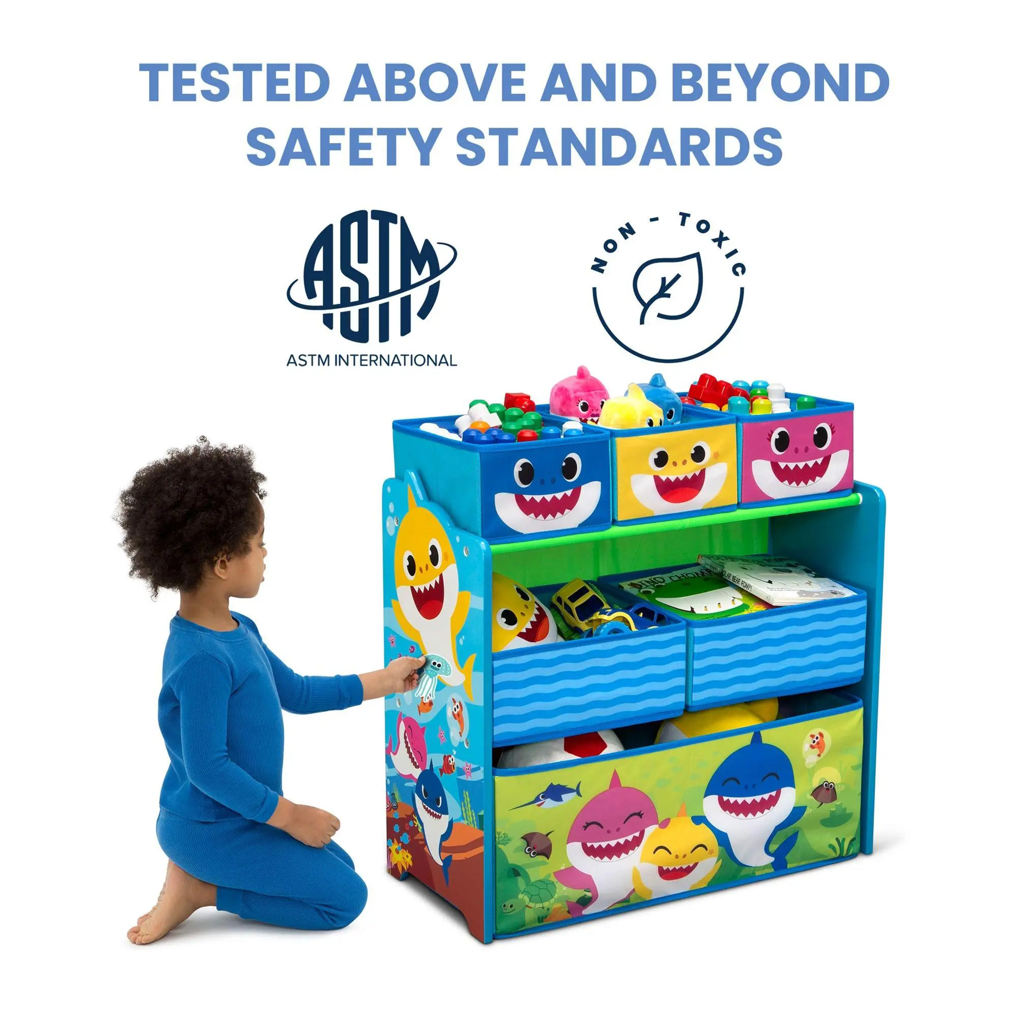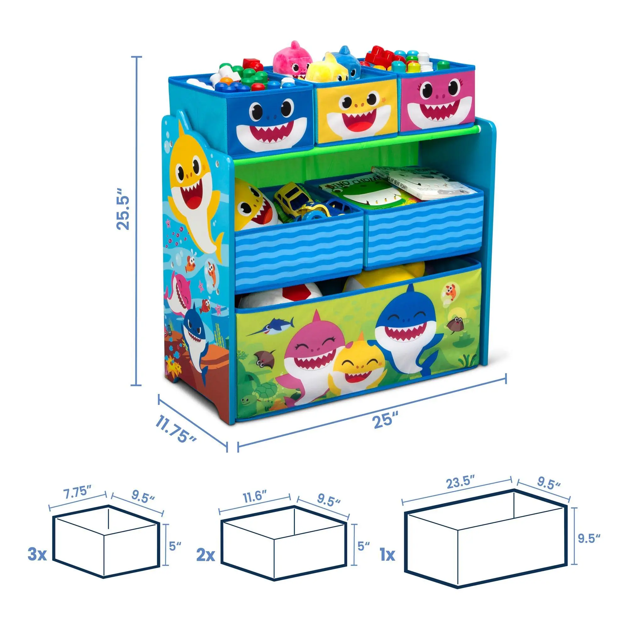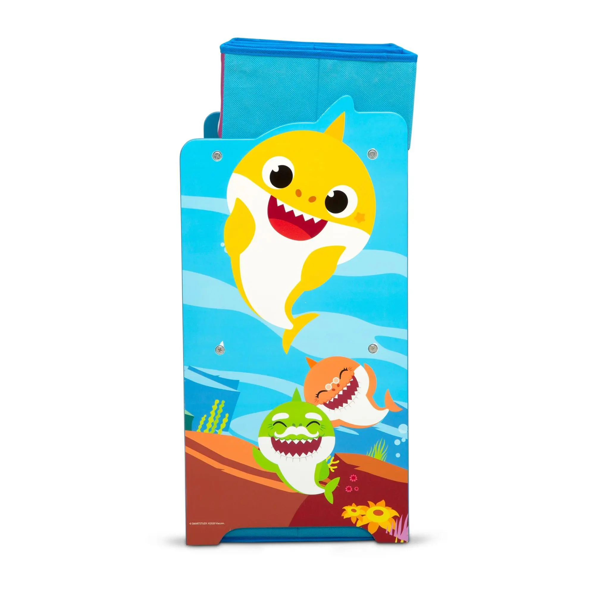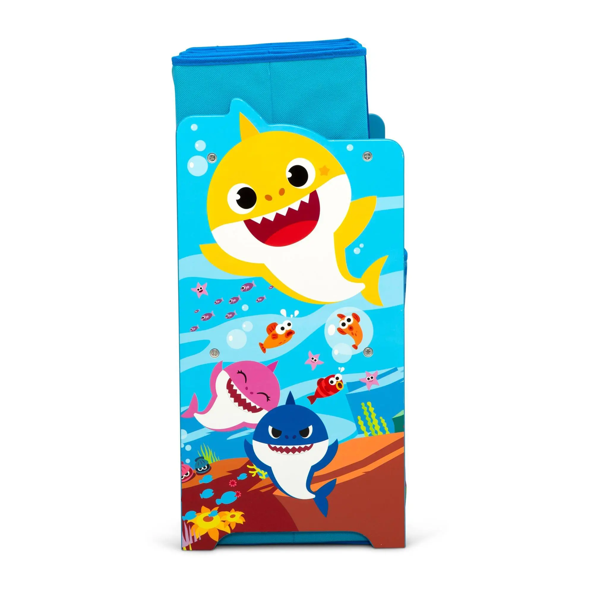 Your little one's playroom or bedroom will be clutter-less and as cute as can be with this Baby Shark storage organizer. Six fabric bins hold and hid toys, shoes, books, crafts, and so much more, all in a super-fun three-shelf organizer featuring colorful Baby Shark graphics. Plus reusable cling stickers let your child decorate to their delight over and over again. From Delta Children.