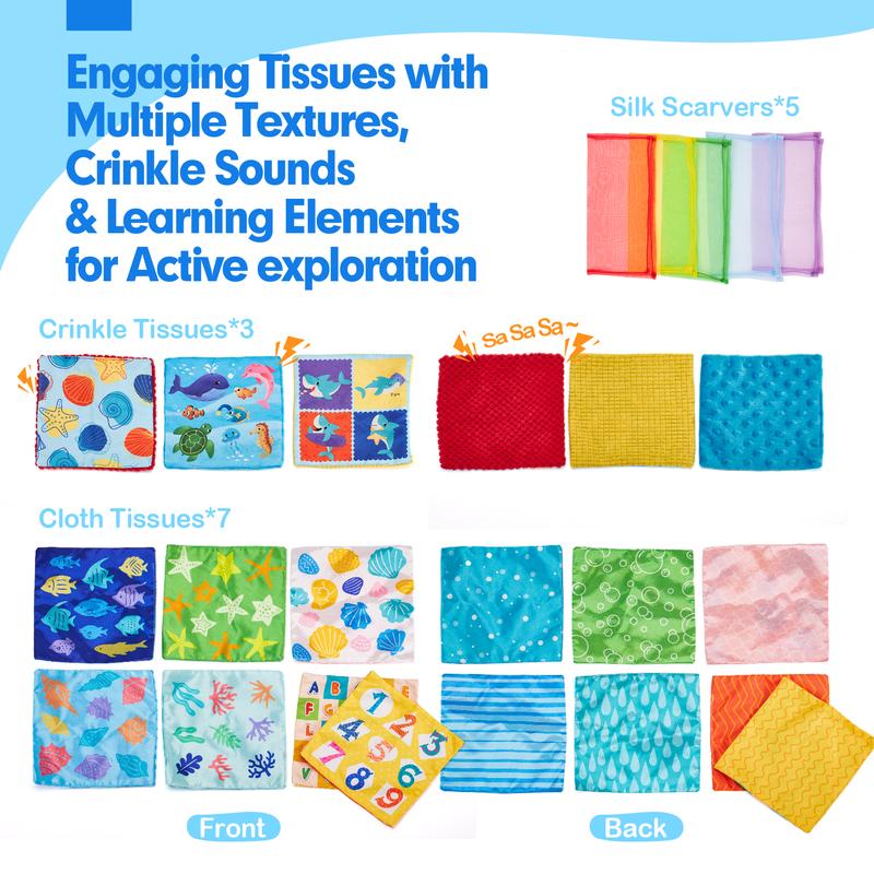 INCLUDED EVERYTHING BABY WOULD ACTUALLY LOVE - This set includes a soft tissue box with textured tails, 6 different textured cloth tissues, 3 crinkle tissues, and 5 silk scarves. It offers a variety of engaging elements and comw with box packaging that is an ideal gift for babies over 6 months old.