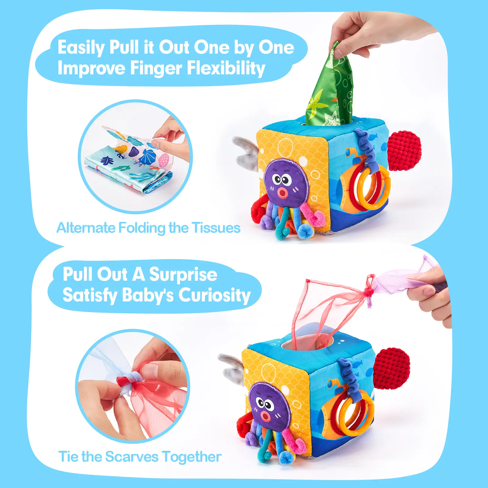 ENHANCE FINE MOTOR SKILLS & CURIOSITY - It offers various ways for babies to explore, allowing them to easily pull tissue out one by one. This activity helps develop their fine motor skills, satisfies their curiosity, encourages exploration and discovery. Additionally, the silk scarves can be tied up, providing surprises for your little ones.