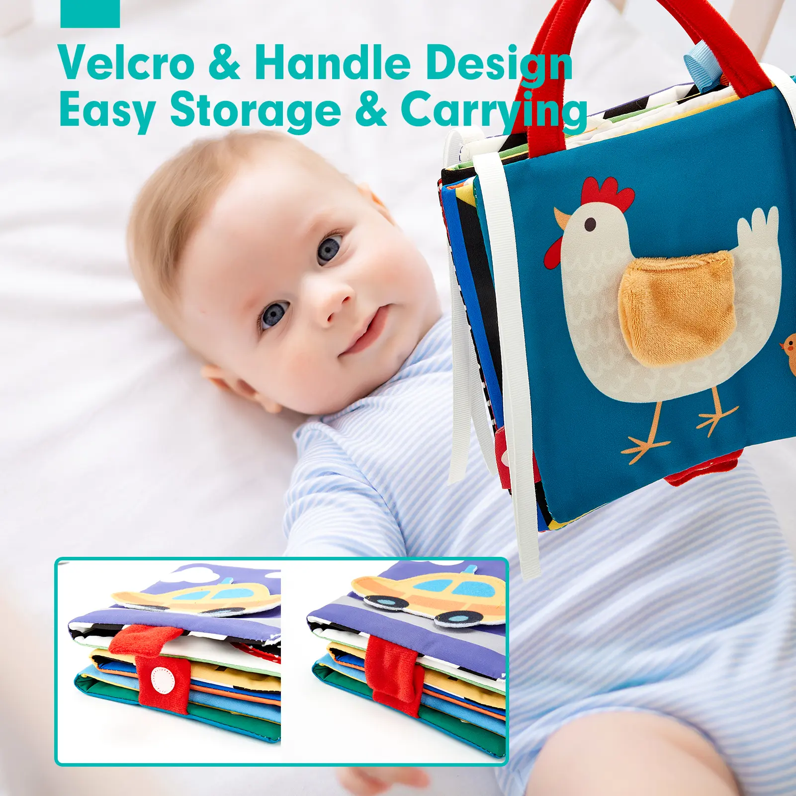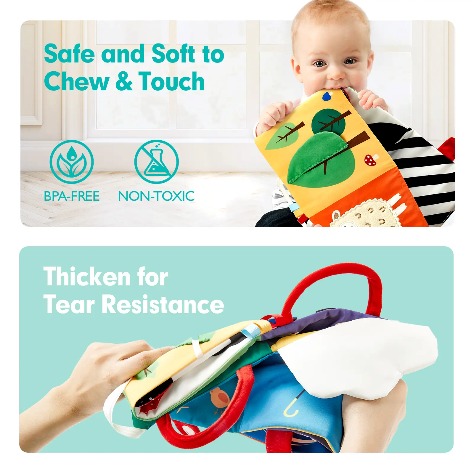 WITH HANDLES and VELCRO FOR EASY STORAGE and CARRYING: The bottom of the Toy has a Velcro design, just fold the toy in order then can be stick up for easy storage. Besides, there is handle design on the top of book make it easy to carry for travel. These books are great baby Christmas gifts and baby shower gifts as they are soft and have lots of things to look at to keep baby entertained