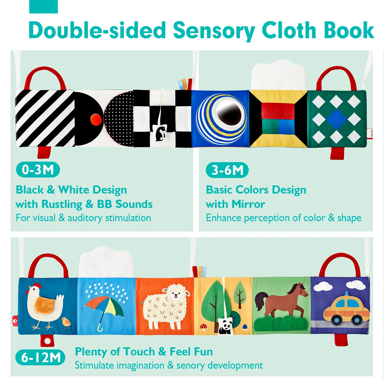PLENTY OF SOUNDS and TEXTURES FOR SENSORY EXPLORATION: Built in crinkle paper, BB device, baby mirror, and has plenty of textured pages and moveable parts, which gets baby's attention, provide them endless activity fun and sensory exploration