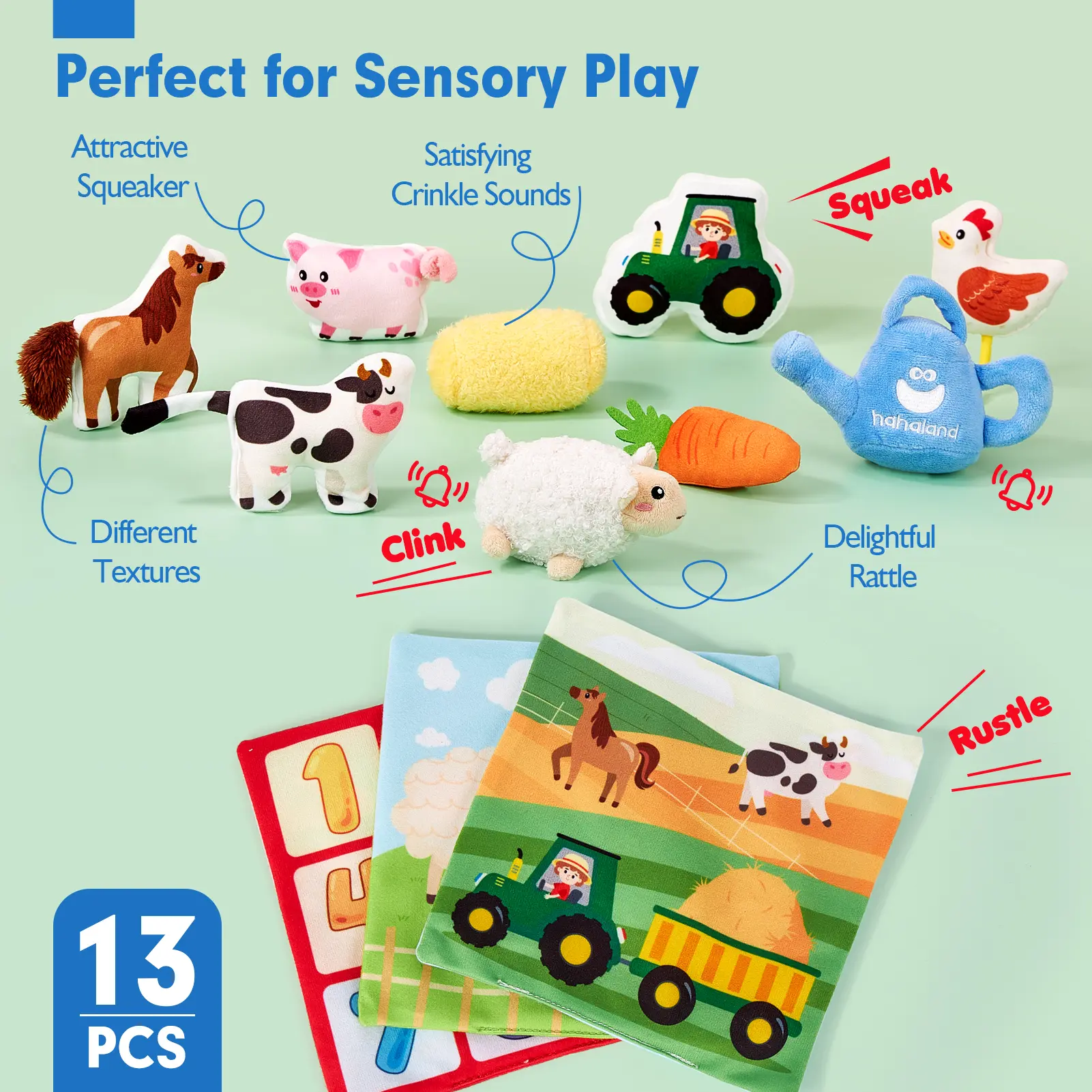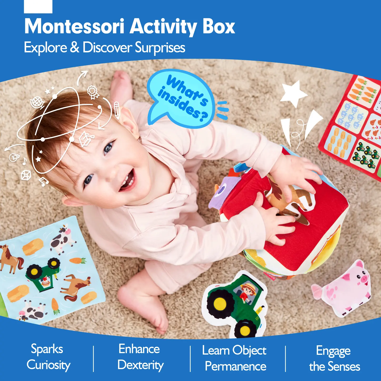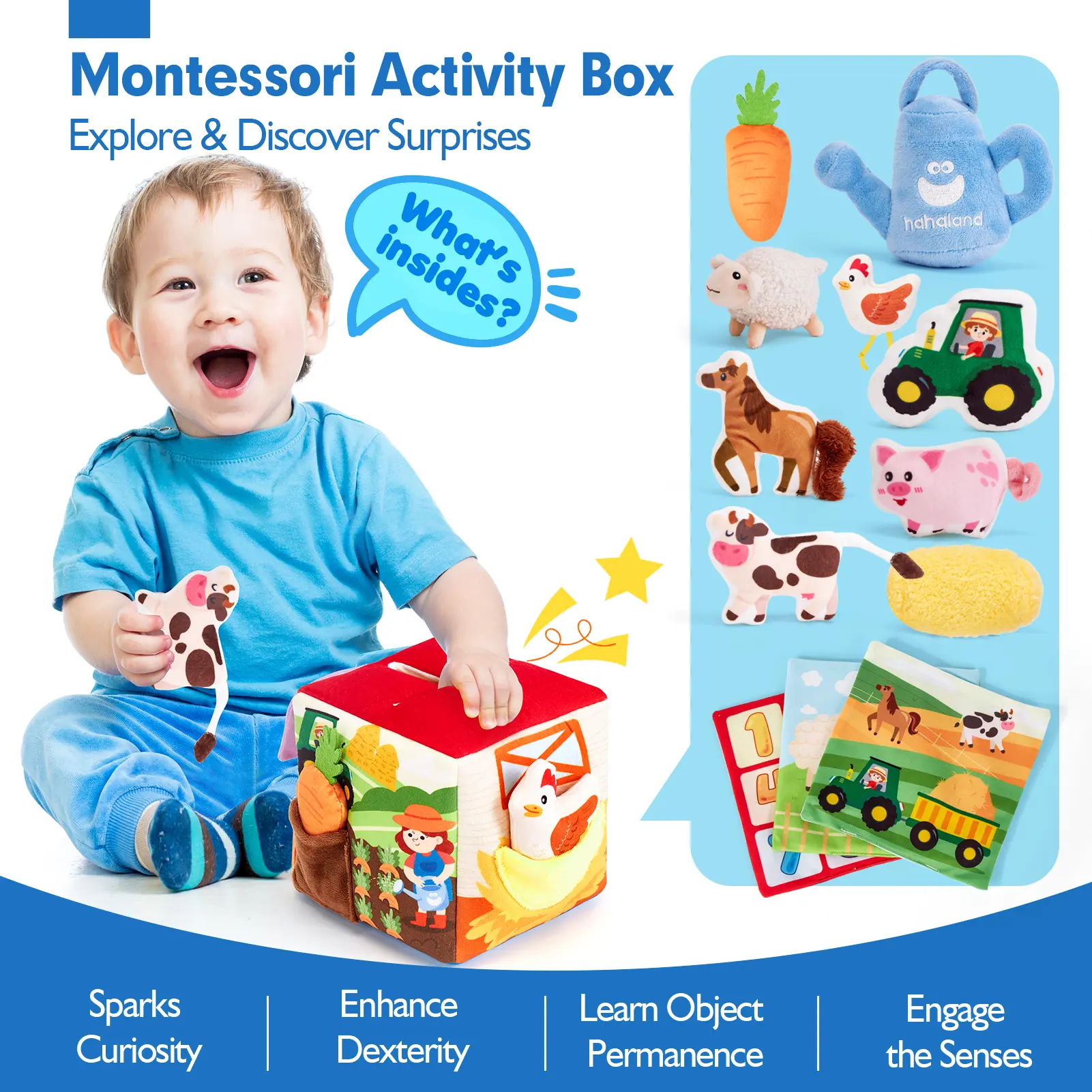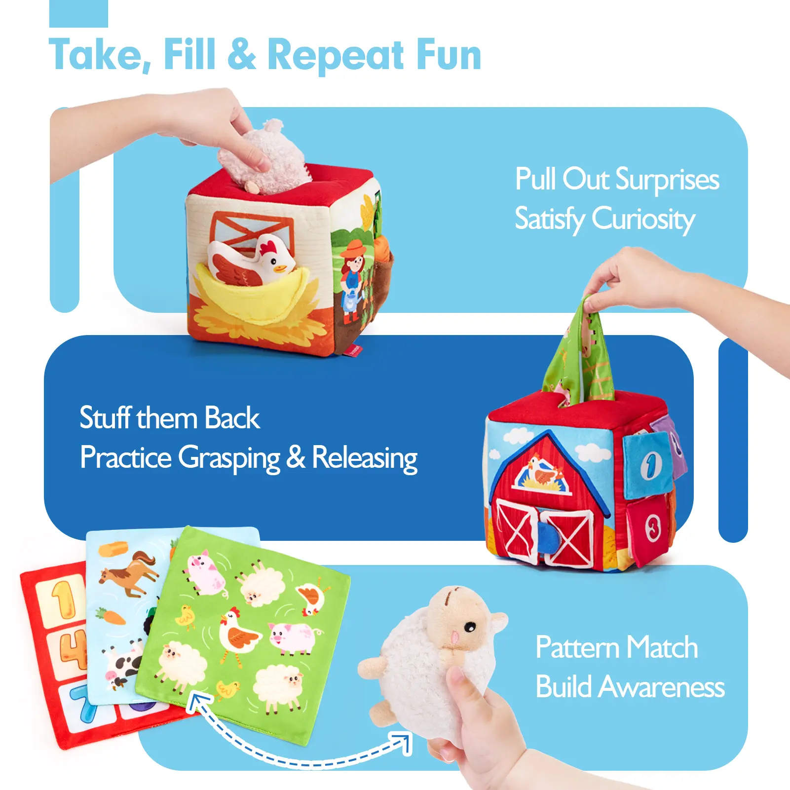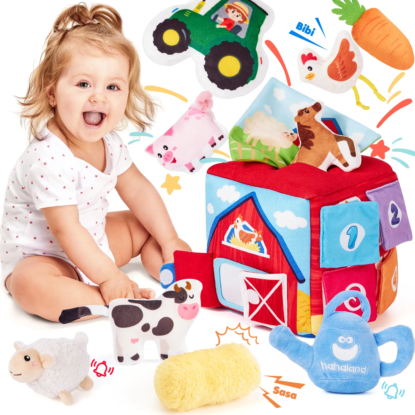 ·What's Inside? Let Your Baby Discover Surprise: Every time your baby reaches into the box to explore, it sparks their sense of wonder, discovery, and curiosity. Our set includes a cube-shaped box, 9 plush toys (sheep, water bottle, haystack, chicken, pig, cow, horse, carrot, tractor) and 3 fabric tissues. It provides endless sensory fun and a delightful surprise with every pull
