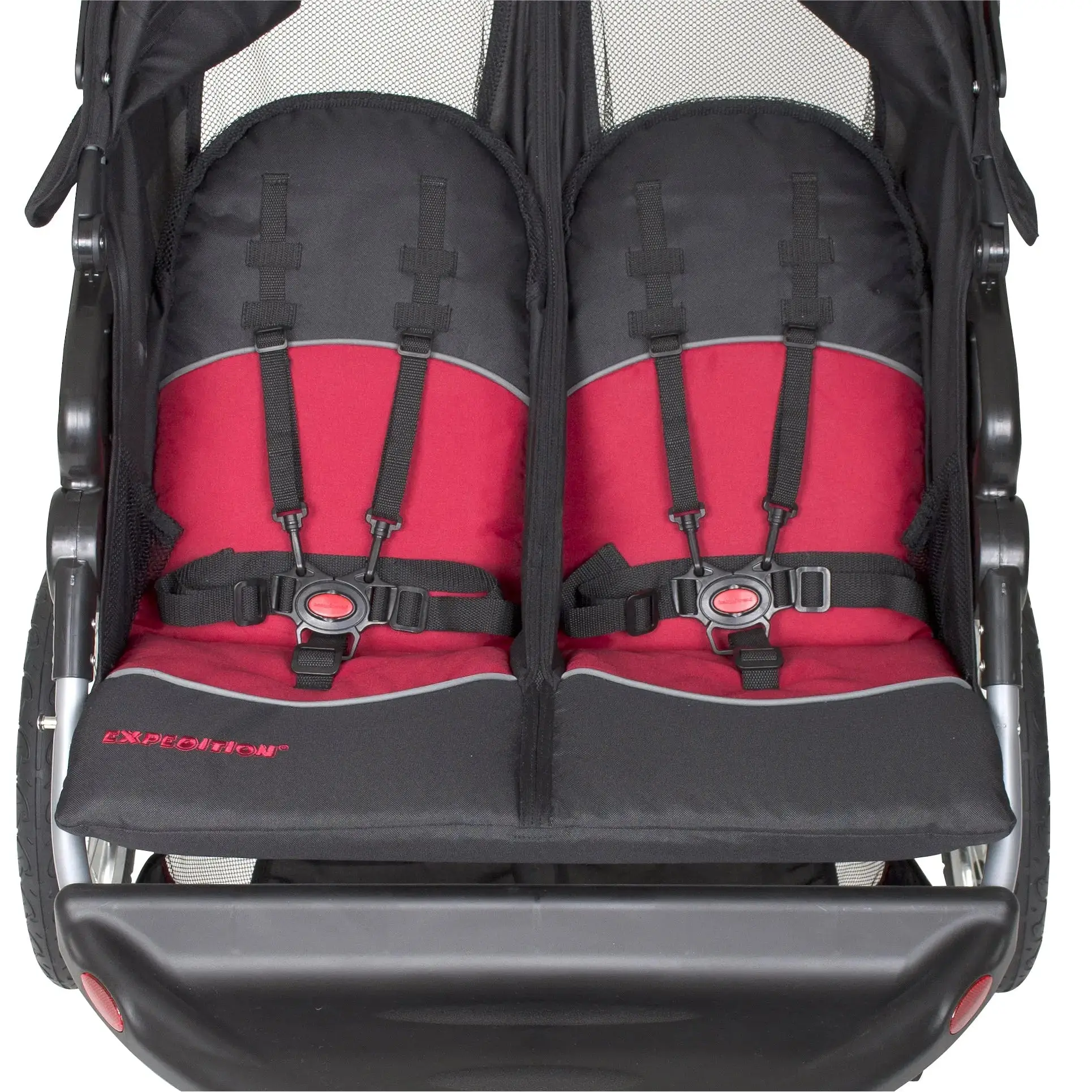 For your convenience, the parent tray includes two cup holders and covered compartment storage. For your children's comfort and safety, the double jogger features a ratcheting shade canopy, a multi-position reclining seat and adjustable five-point safety harnesses. Store your children's necessities in the large storage basket and you're ready to roll. Know you're traveling safely in this sturdy, lightweight double jogger that's certified by the Juvenile Products Manufacturers Association. At the end of your trip, quickly and easily fold the stroller into a compact unit.