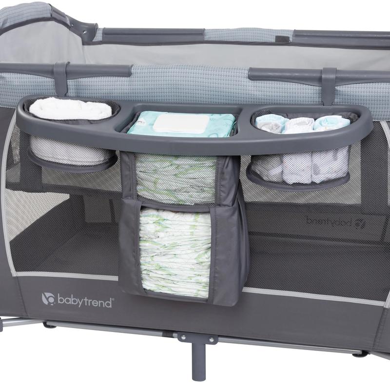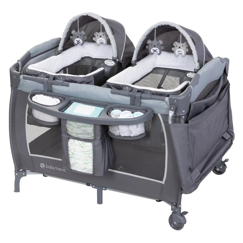 The Baby Trend® Lil Snooze™ Deluxe III for Twins features two Removable Rock-A-Bye Bassinets with a canopy, plush fabric and mesh sides for proper ventilation and two hanging toys. The playard includes a removable full bassinet that allows it to convert to a full-size playard, a flip over changing table and a deluxe parent organizer to hold all of the essentials.