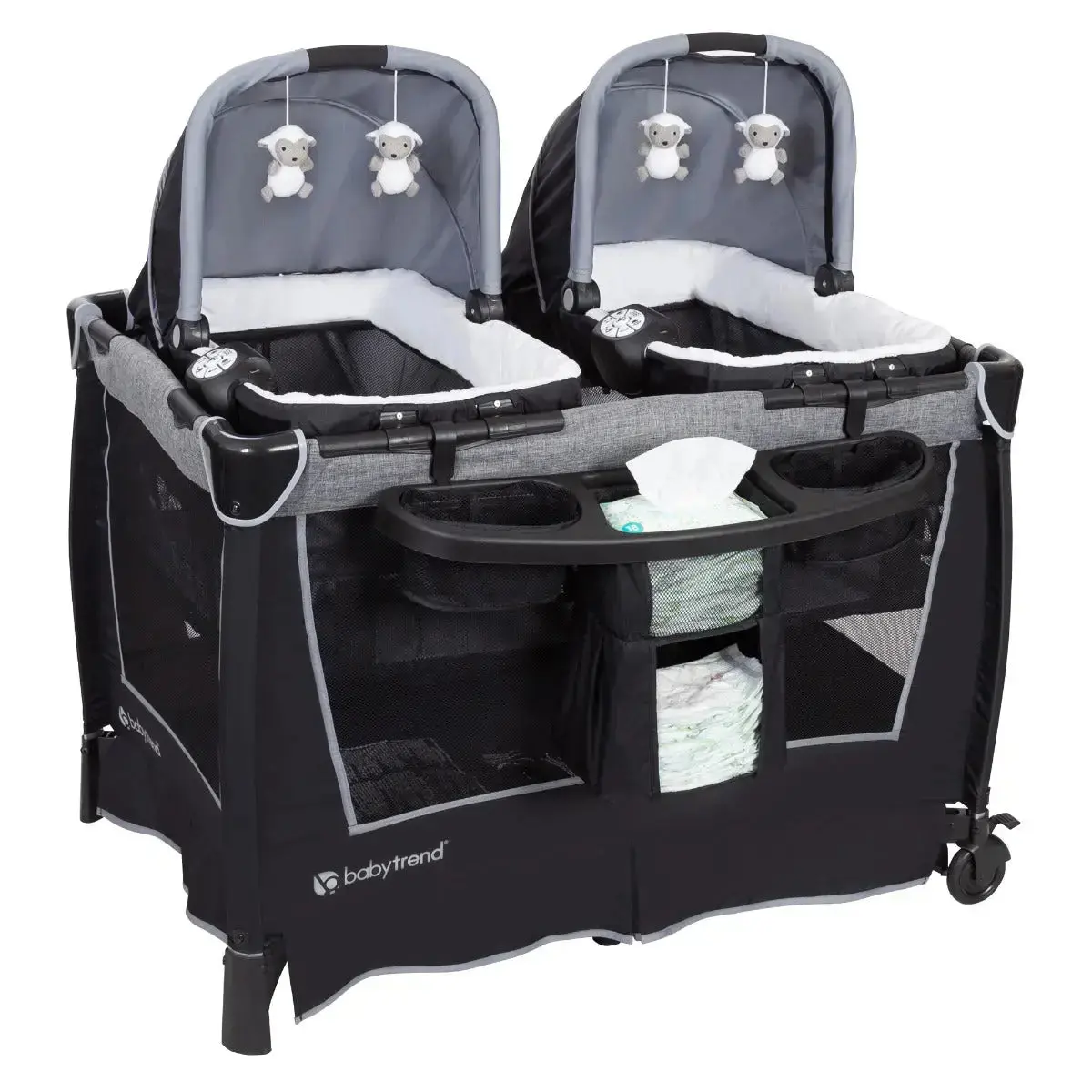 The Baby Trend® Retreat Twins Nursery Center® playard is the perfect solution for parents with twins. It features two removable Rock-A-Bye Bassinet side by side, with their own canopy and carry handle, plush fabric, and mesh sides for proper ventilation for removability. Each bassinet includes 2 toys.