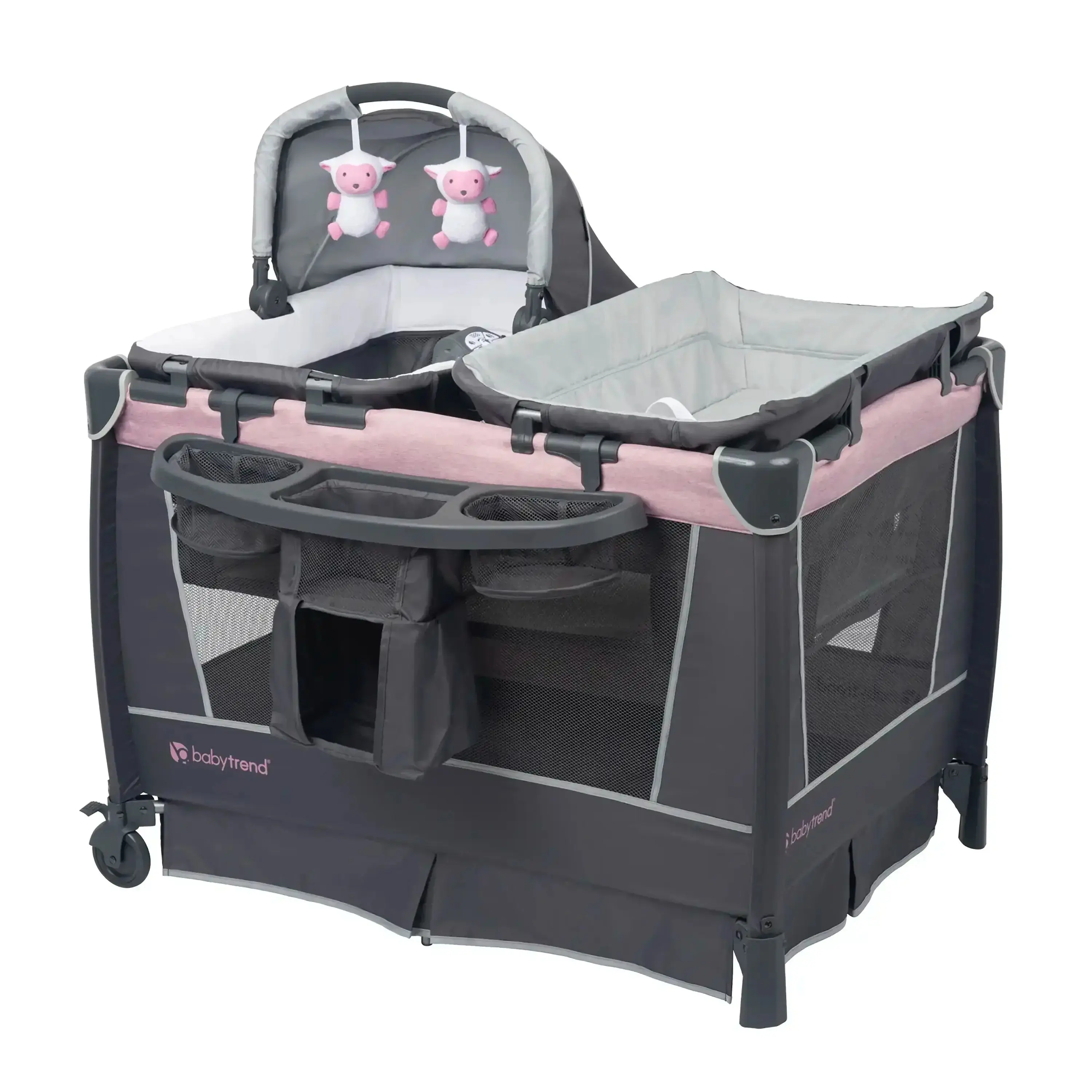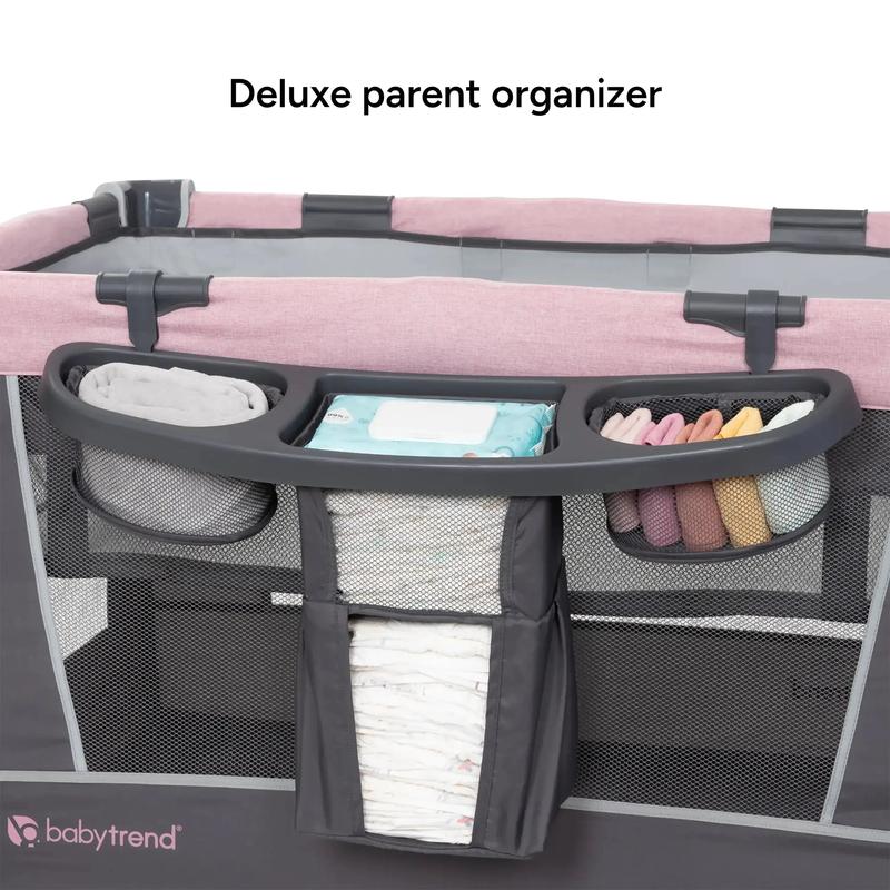 The Baby Trend® Simply Smart™ Nursery Center® features a Removable Rock-A-Bye Bassinet with a canopy and carry handle, plush fabric and mesh sides for proper ventilation, and 2 toys.