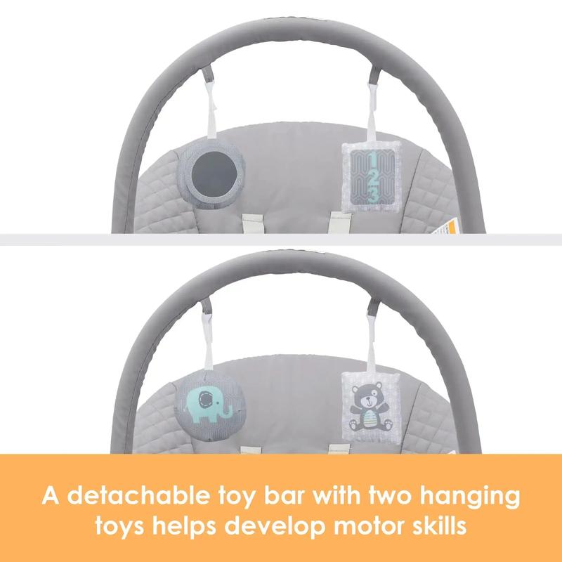 ·A detachable toy bar with two hanging toys helps develop motor skills.