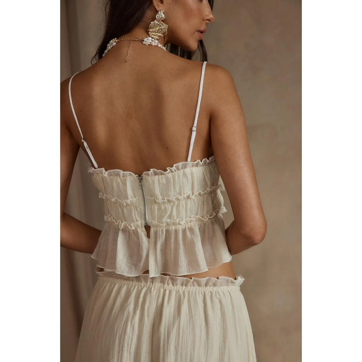 baby yellow cropped tankadjustable spaghetti strapstie detail on the frontlightweight materialruffle detailzipper back closurelined bodicehanger straps100% polyester