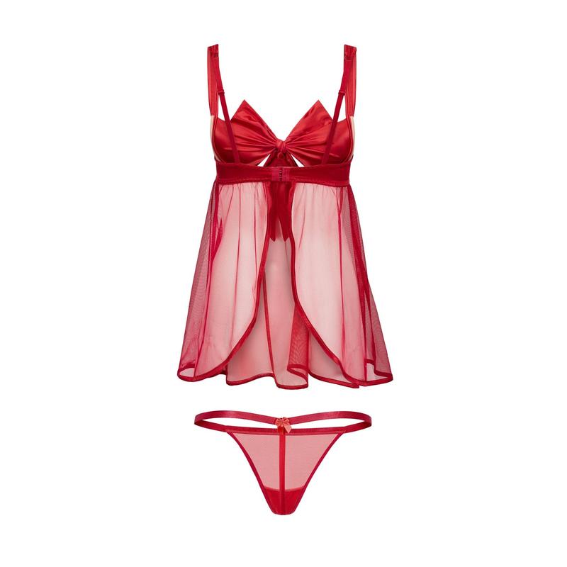This satin babydoll has a giant bow that literally "unwraps" to reveal unlined cups and the presents underneath! The back straps are fully adjustable and it also features a hook and eye closure. It comes with a matching g-string.