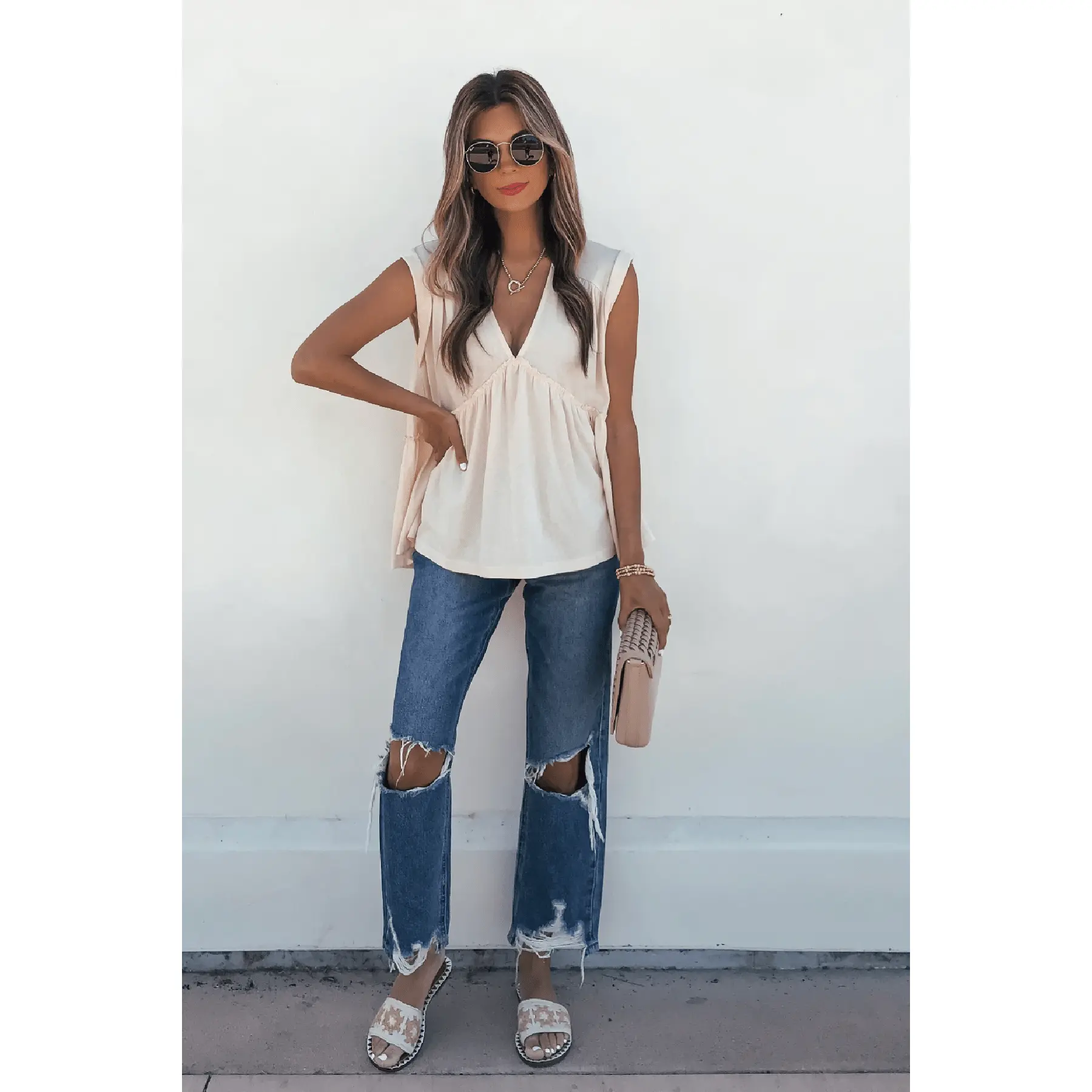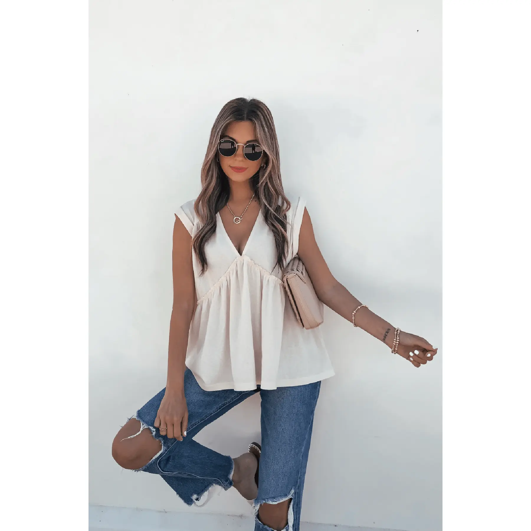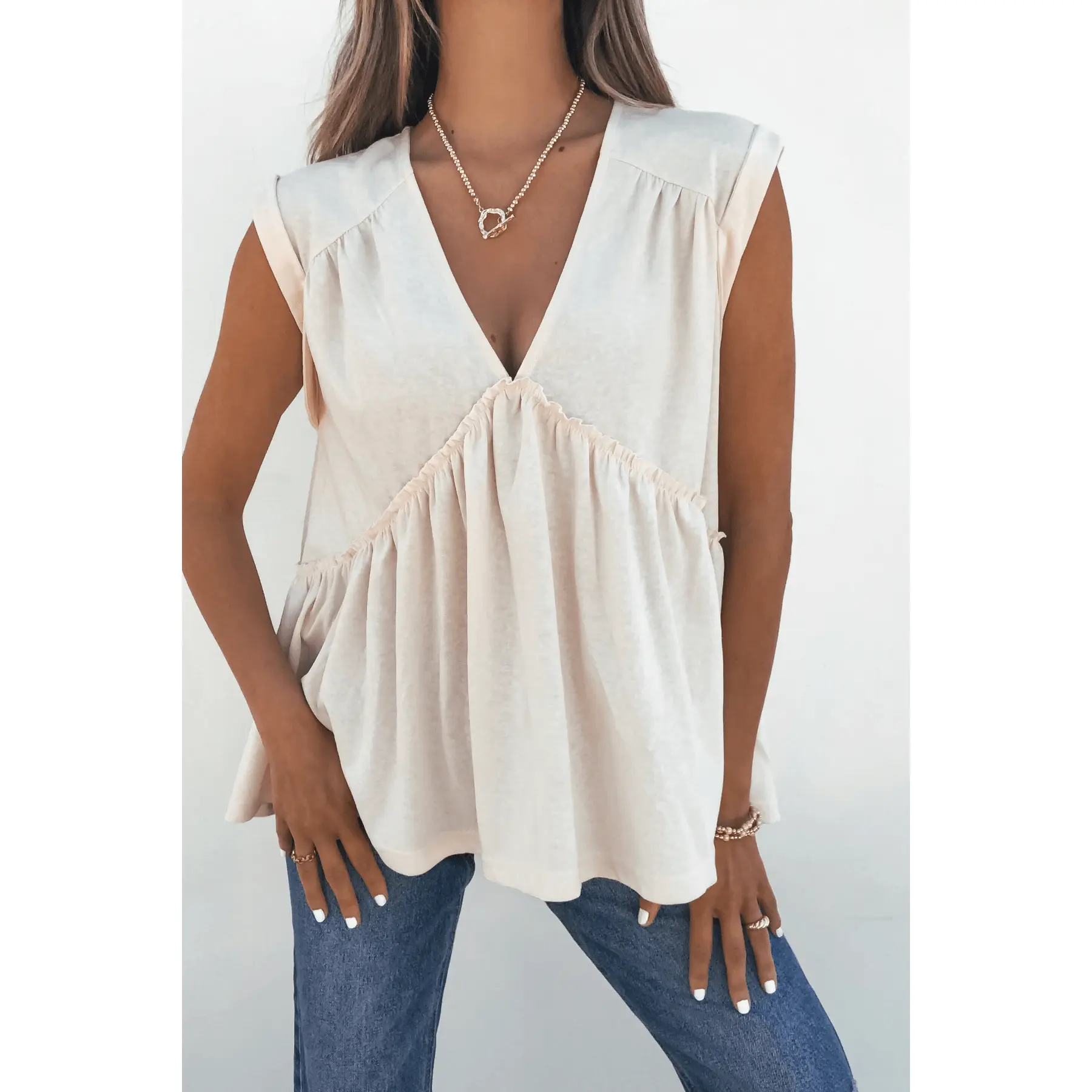 This cream babydoll top features permanent rolled cap sleeves, a relaxed V neckline, and an oversized fit that drapes beautifully. Ruffled details add a flirty, feminine finish, making it perfect for casual outings, weekend brunch, or an easy day at the beach.