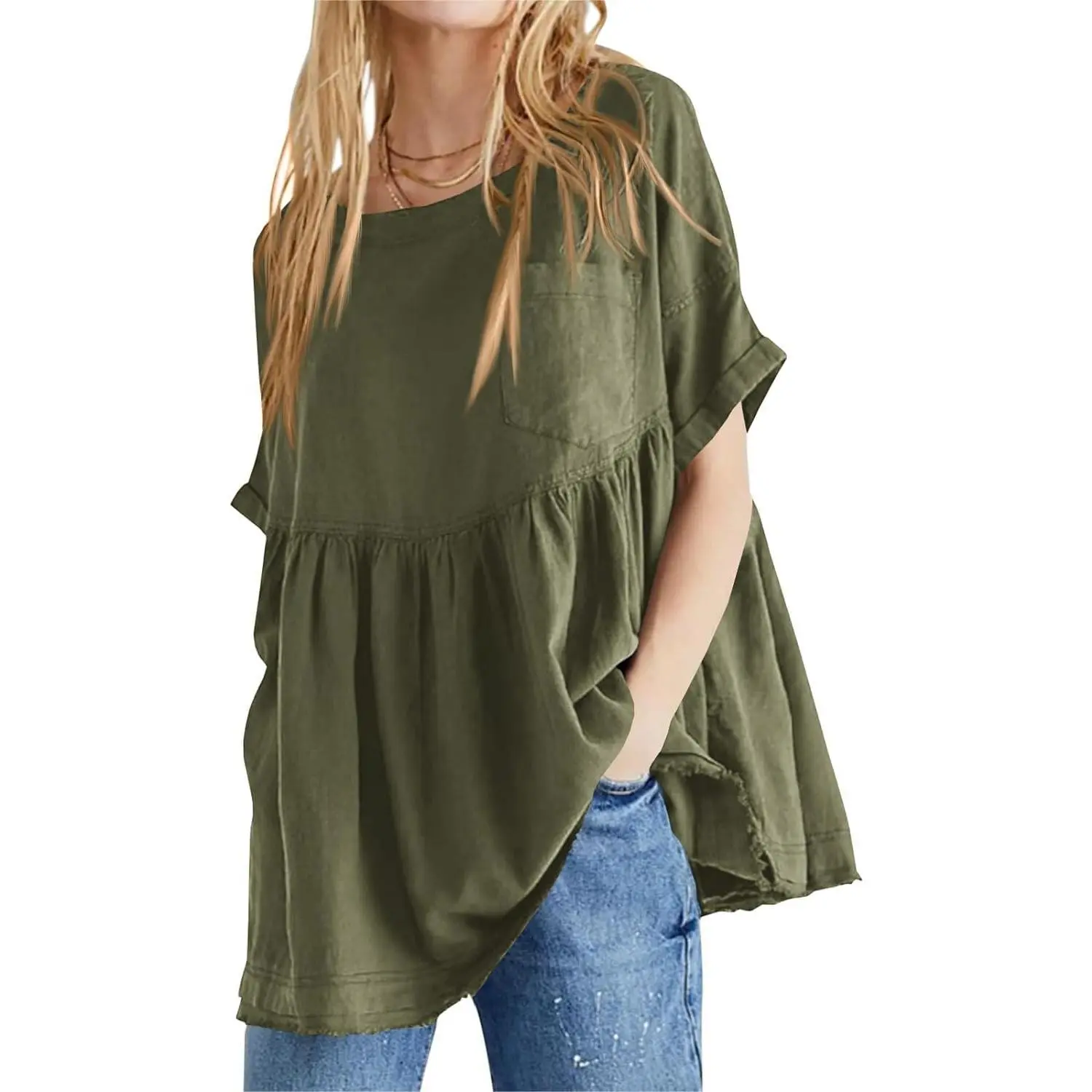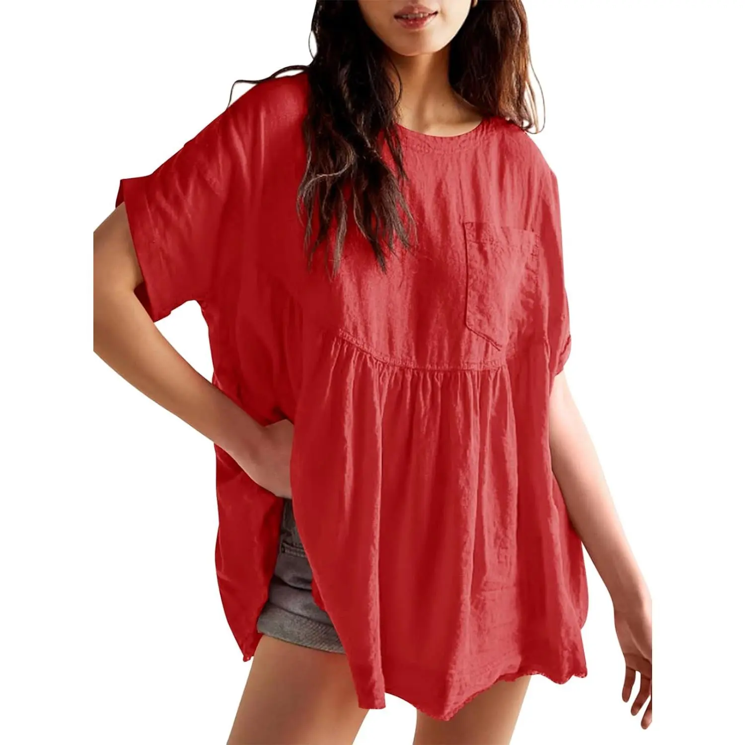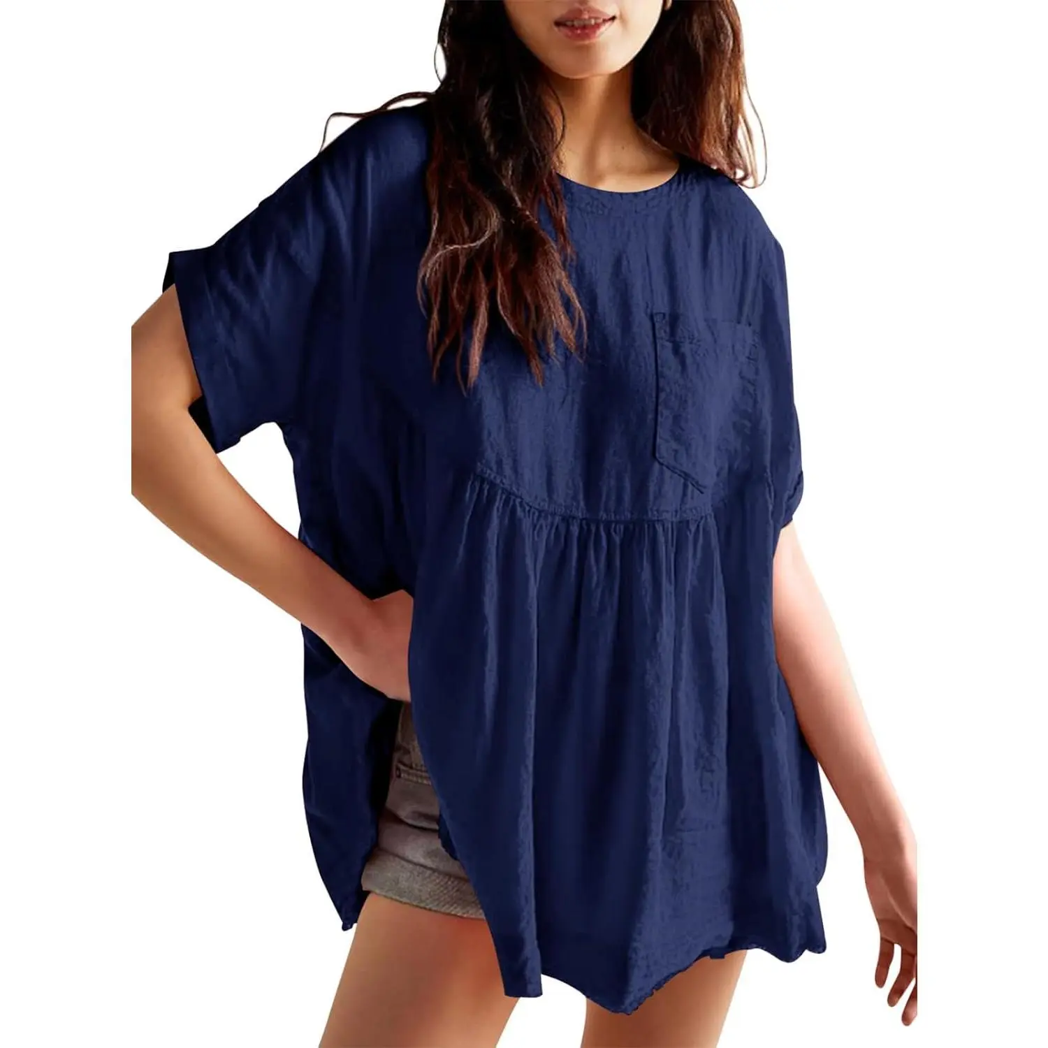 ·Design: Loose fit, oversized, babydoll-inspired silhouette, short sleeve, crew neck, chest pocket, keyhole closure at back, pleated detailing for added fashion, solid color, summer peplum tops, loose mini dress