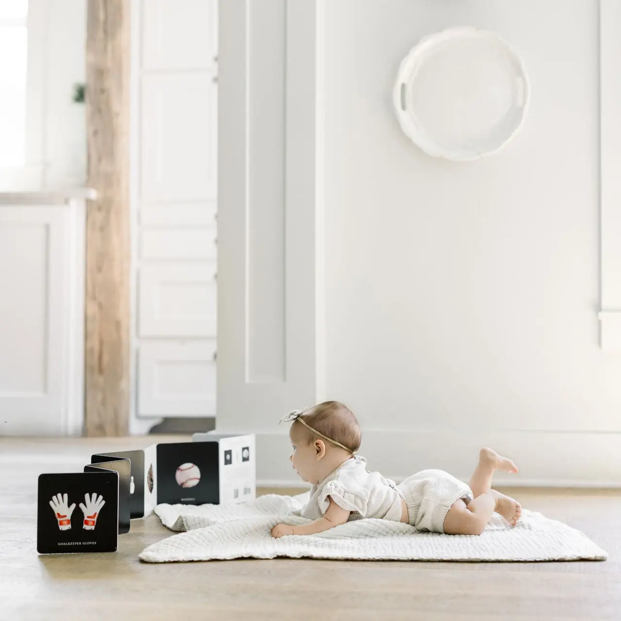 This high-contrast baby book features striking black-and-white sports artwork designed to support your baby’s visual development. The unique accordion-style format stands upright on its own—making it perfect for tummy time!