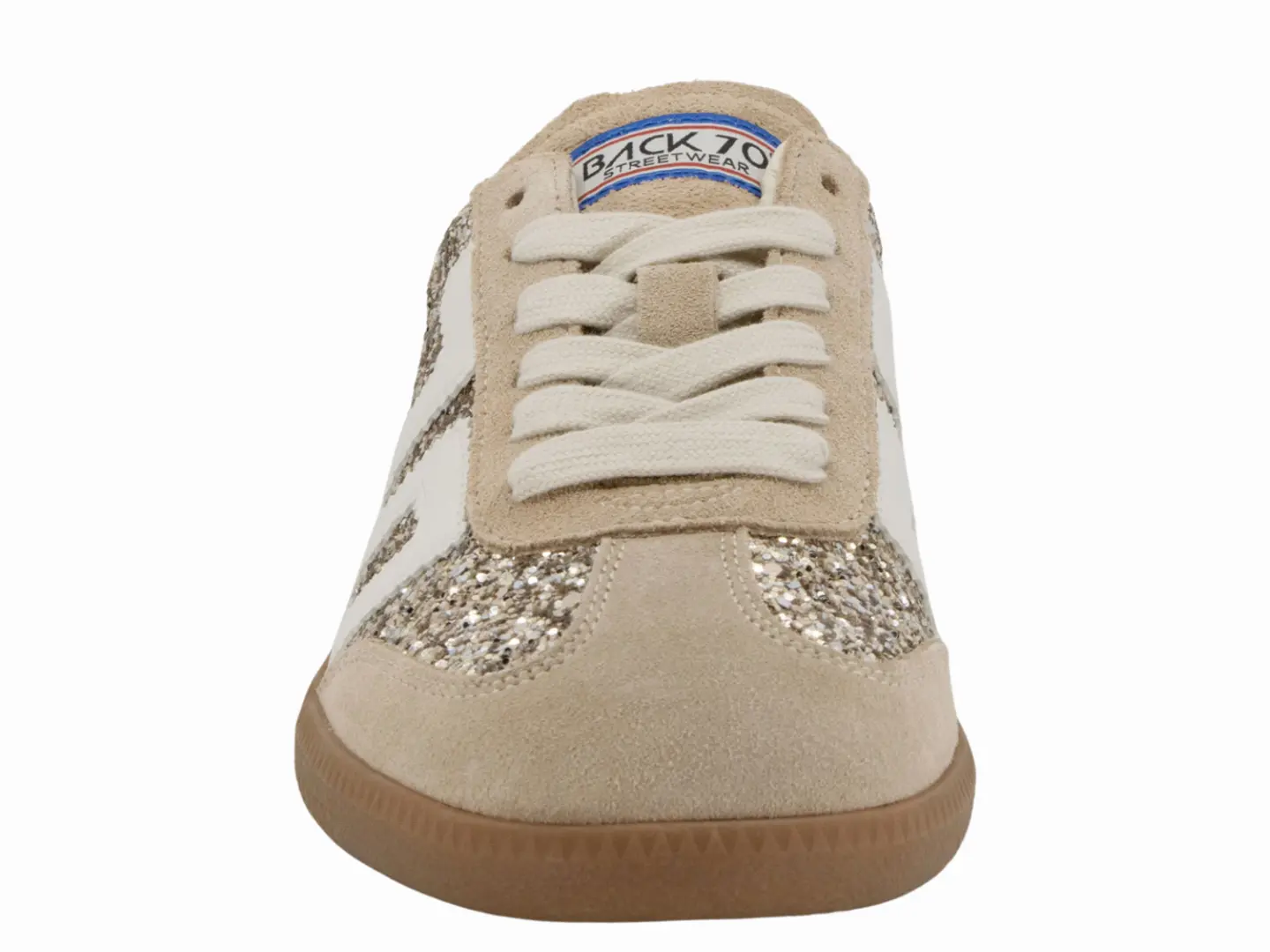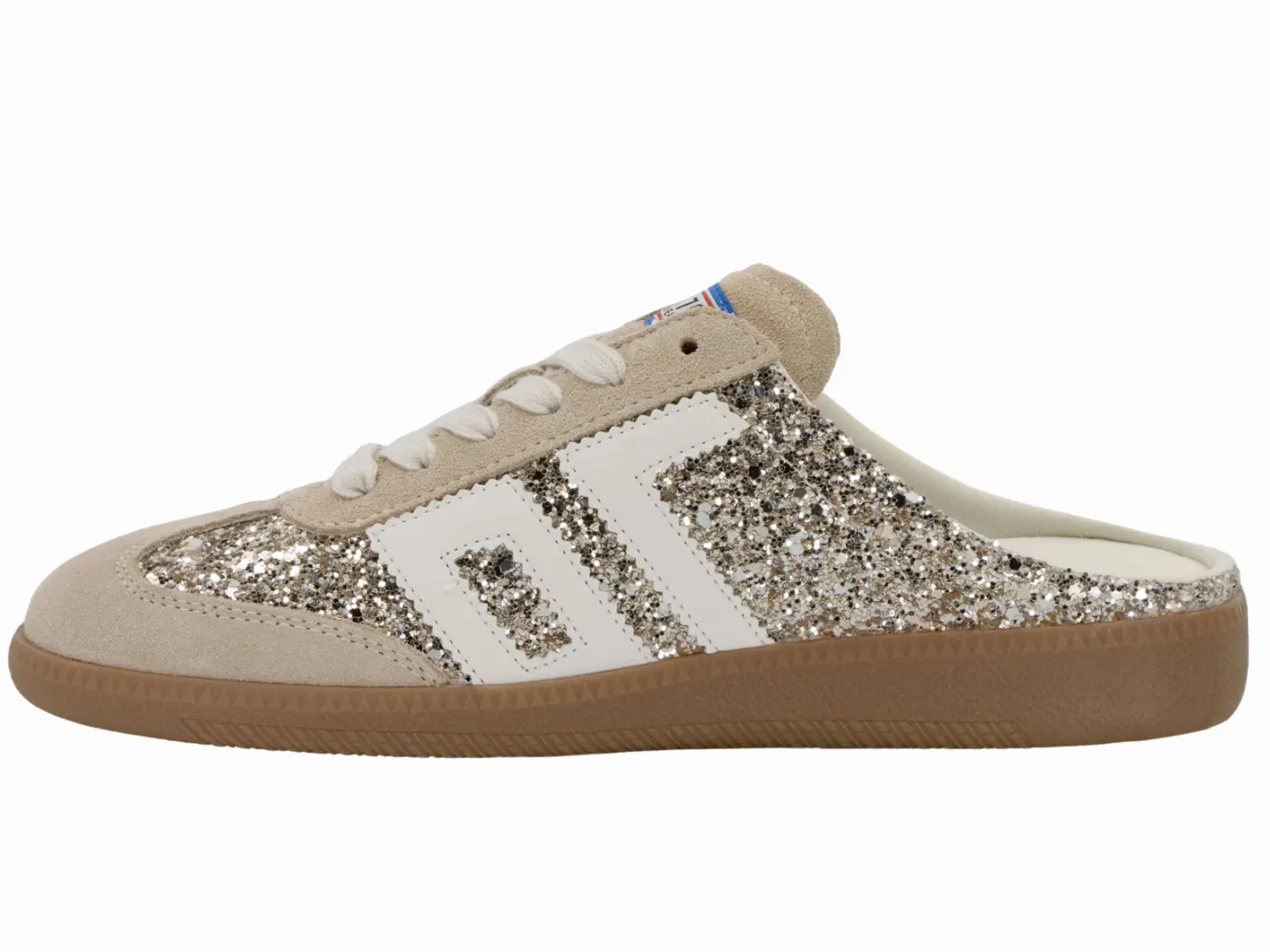 The Back 70 glitter mule brings sparkle to everyday style with a distinctly feminine, boho edge. Designed in shimmering gold glitter, this effortless sneaker mule blends laid-back charm with the brand¿s signature vintage detailing. The open-back silhouette adds ease and personality, while subtle suede trims and retro accents keep it unmistakably Back 70. A perfect mix of glamour and casual cool, it¿s made for the girlie girl who loves her sneakers with a little shine.