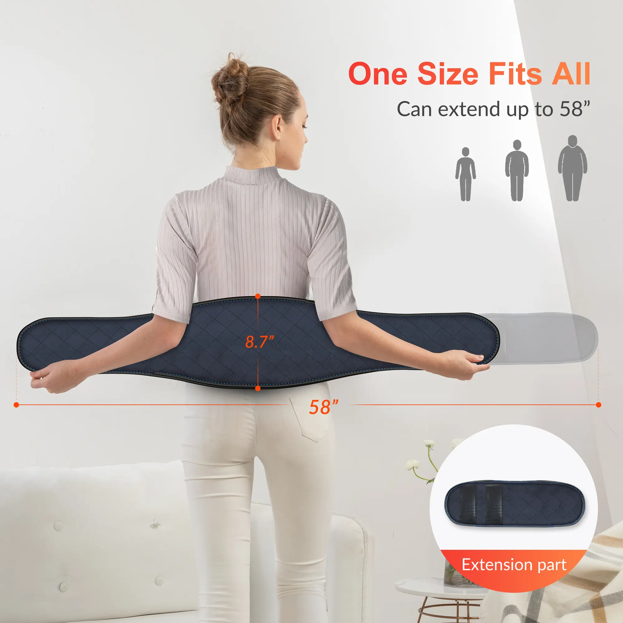 ·Flexible to fit all - This wrap around heating pad is flexible, with an adjustable strap to extend to up 58 inches to fit all sizes. So it can be enjoyed by both man and women of all shapes and sizes. It makes a great wellness gift for men, women, for birthday, Mother’s day or Father Day gifts.The max. wasit band size is 58 inches, the minimum size is 44.3inches;