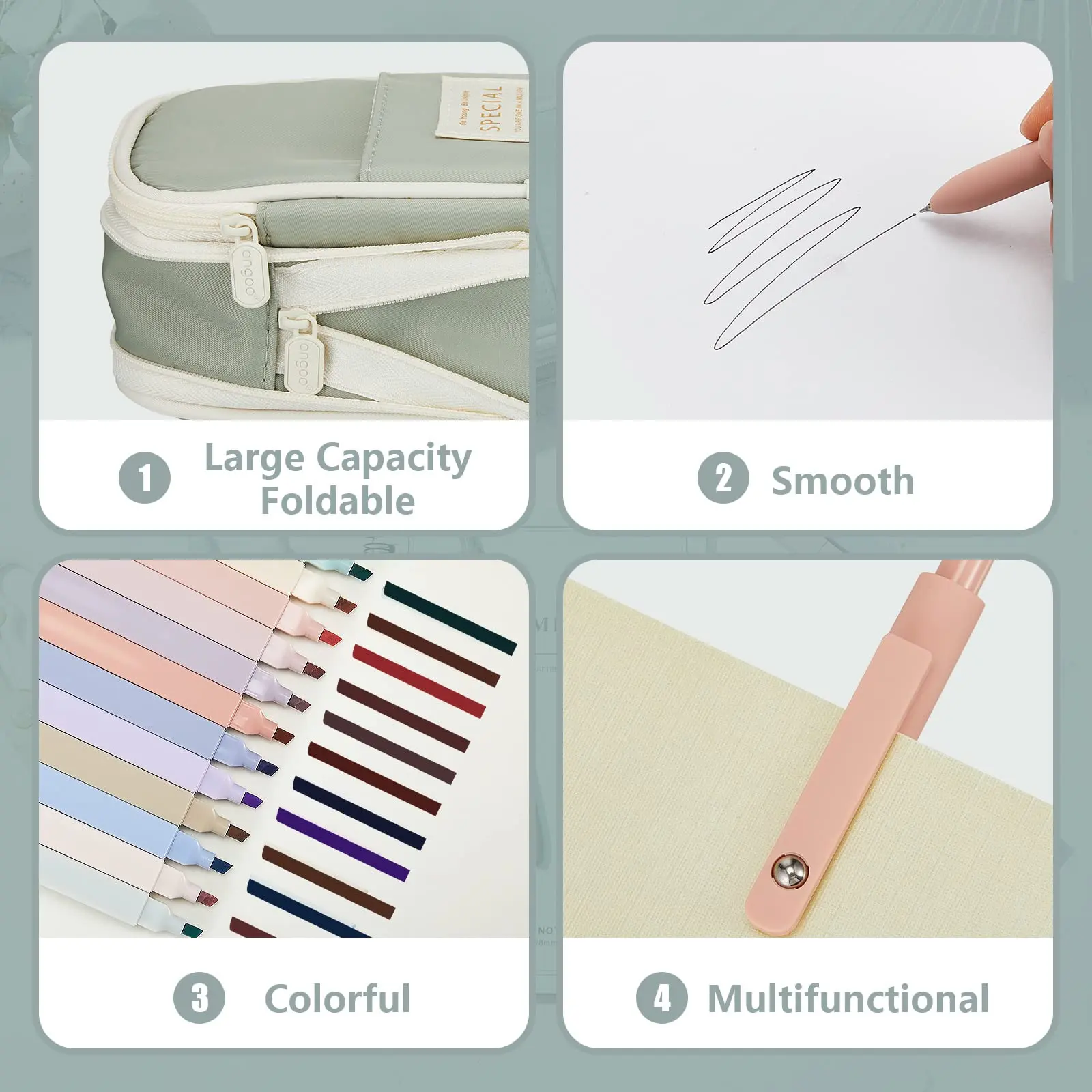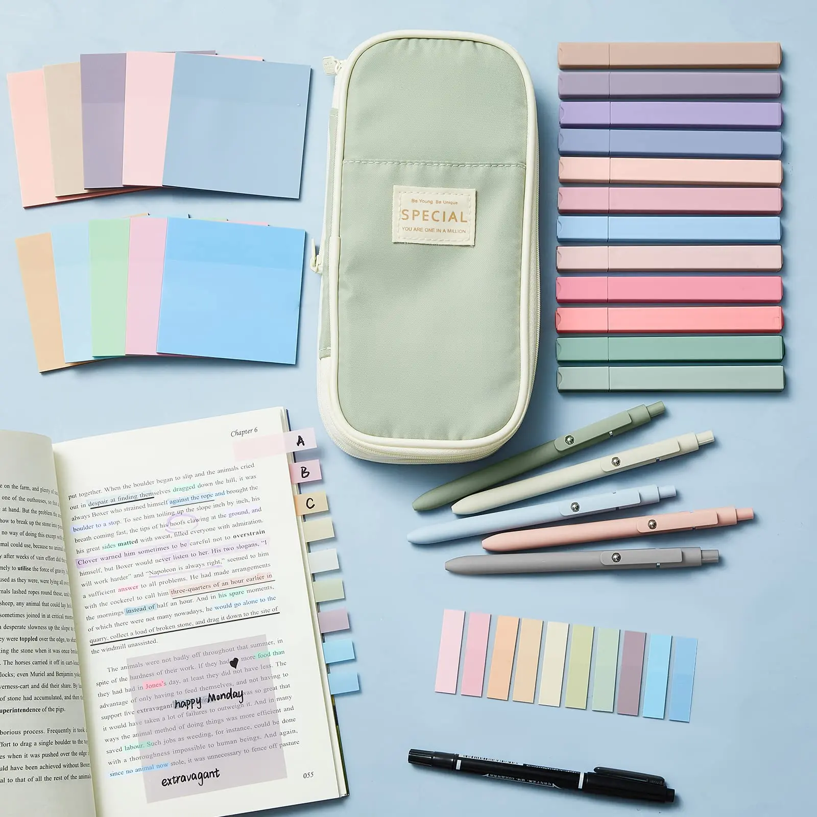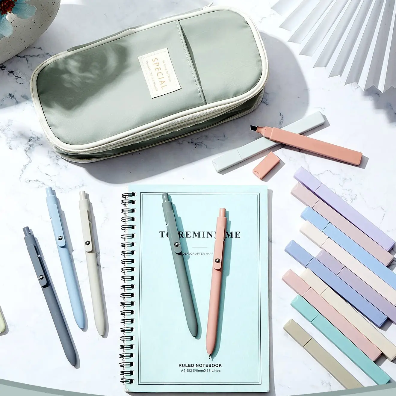 Everything was really good quality and super cute colors! I LOVE how the pens have some weight to them since it makes them easy to grip (and the sensory metal ball that moves is pretty satisfying). The tip of the pens is also really nice! (The ink does smudge in the post its tho!) I also love how the pouch has a zipper which helps it turn a little bit bigger so more stuff fit. Itās a lot of extra products for each item, so i think itās totally worth the price.