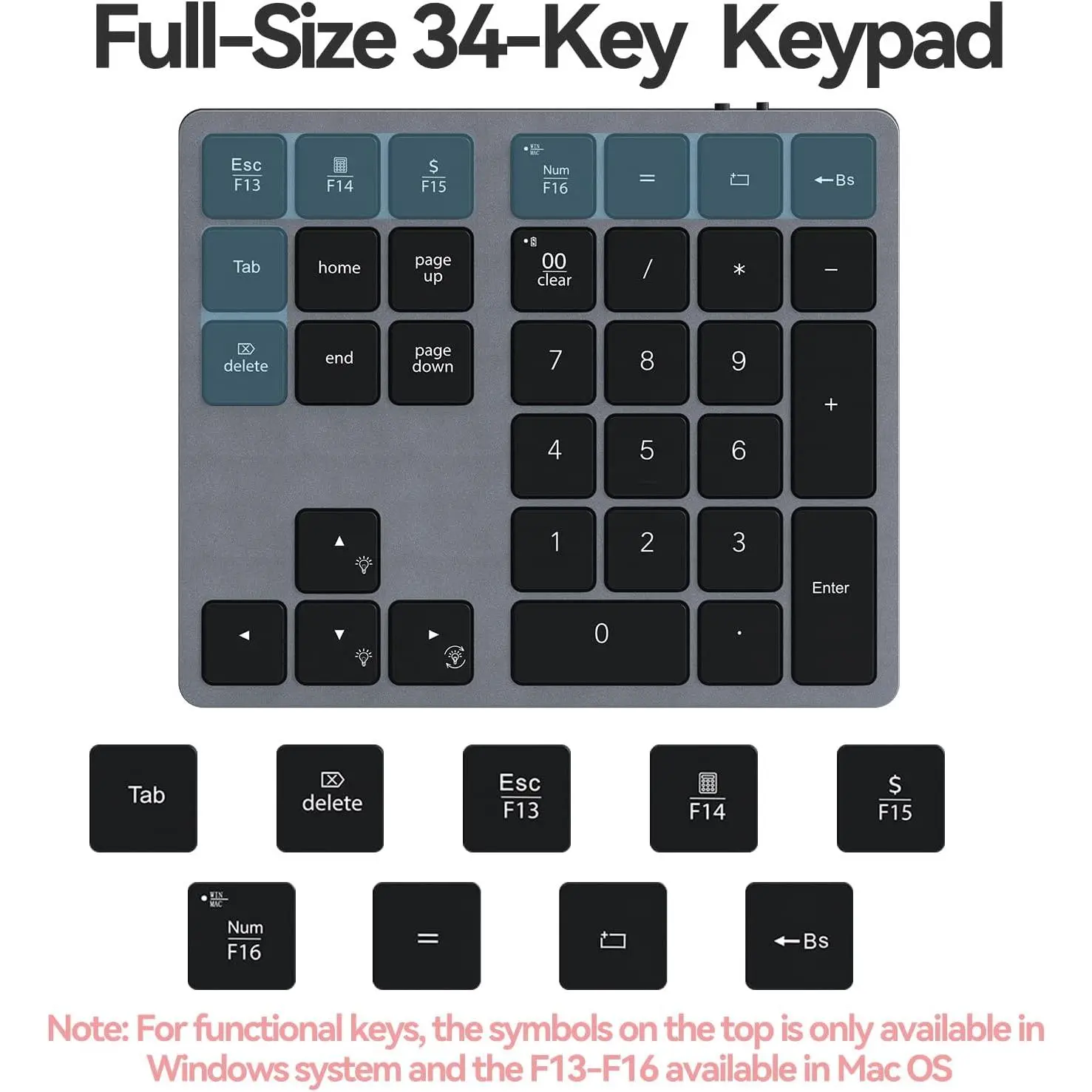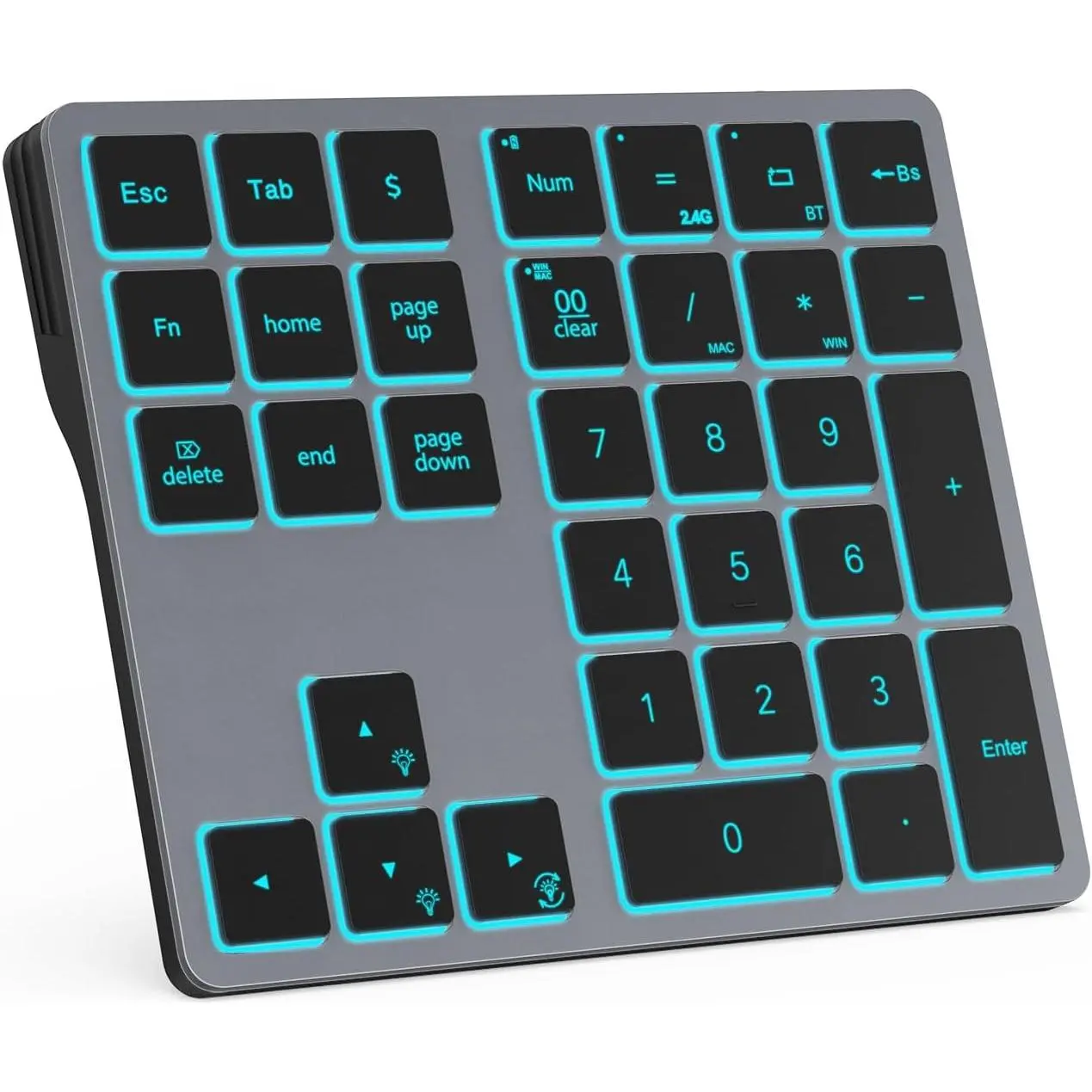 Backlit Numeric Keypad for Laptops and Computers, Number Pads 34 with 7-Color Backlight for MacBook & Windows, Gray