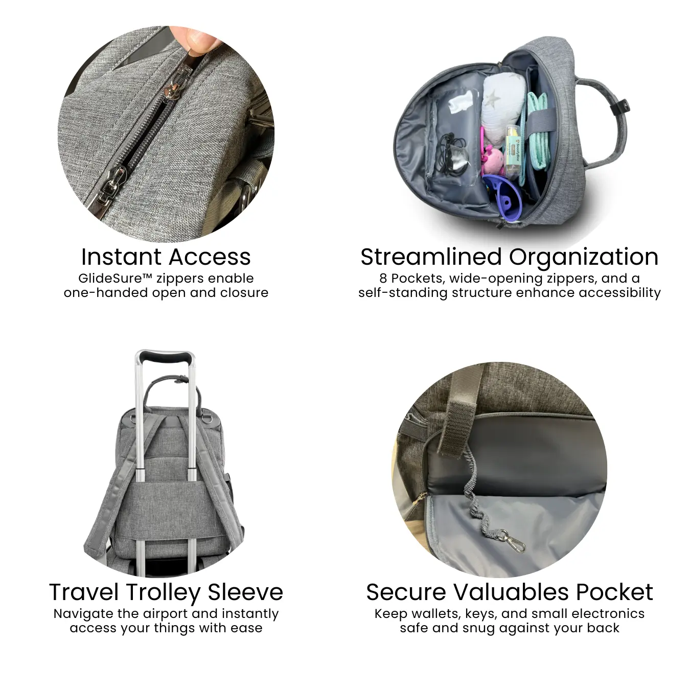 ·Glidesure zippers open and close with just one hand for easy access.