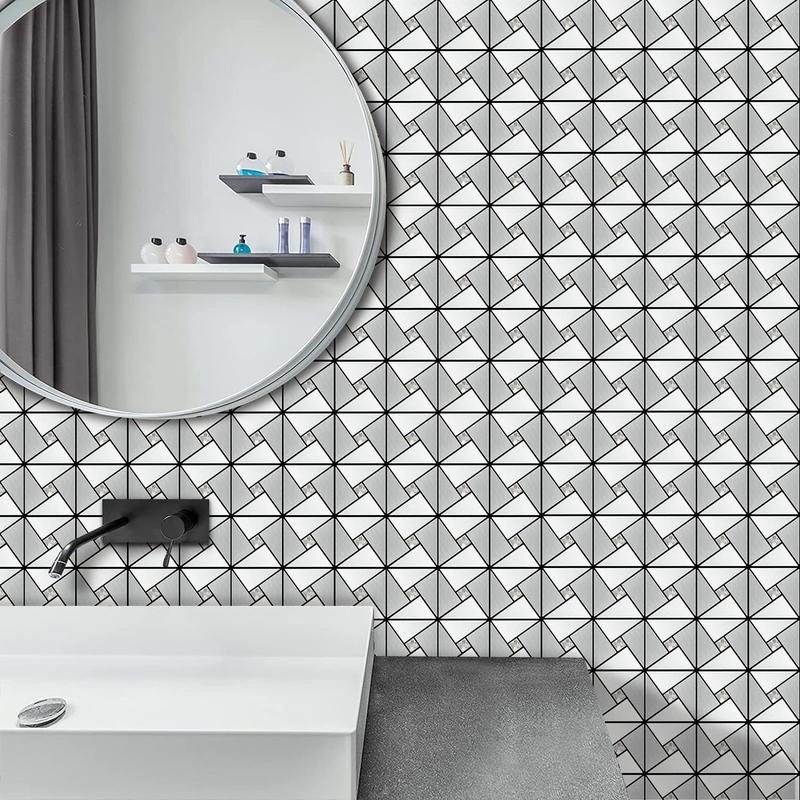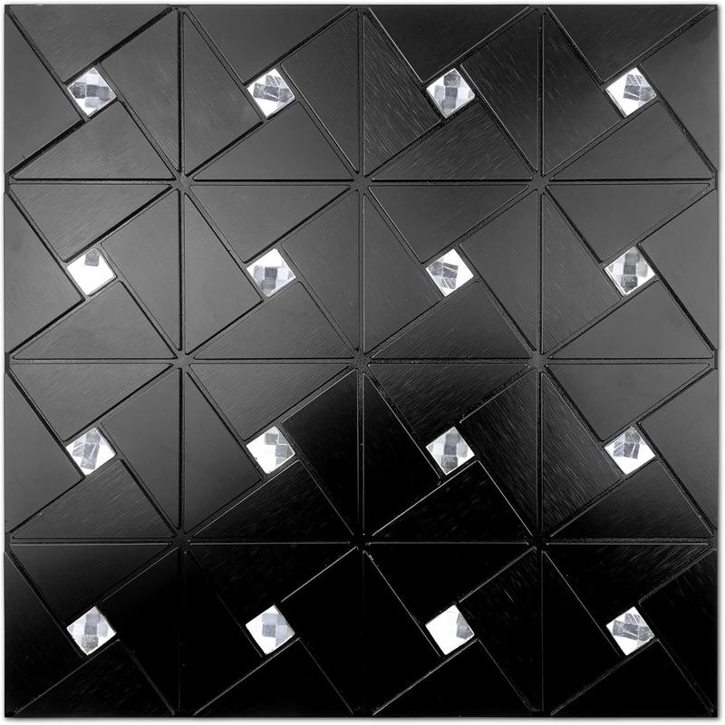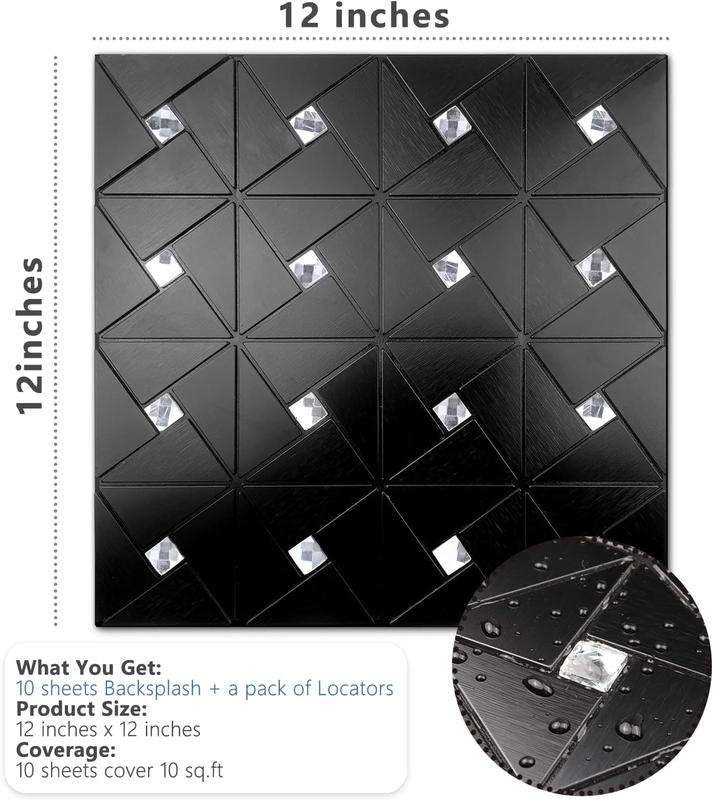 ·PINWHEEL PATTERN TILE:10 Sheets high quality black peel and stick tile stick on backsplash for kitchen, 12"x12"x0.12" each, cover about 10 square feet. This square peel and stick backsplash makes installation easier and reduces cutting waste. Bright triangular cut metal and glass designs combine to make your overall home look brighter and more spacious.
