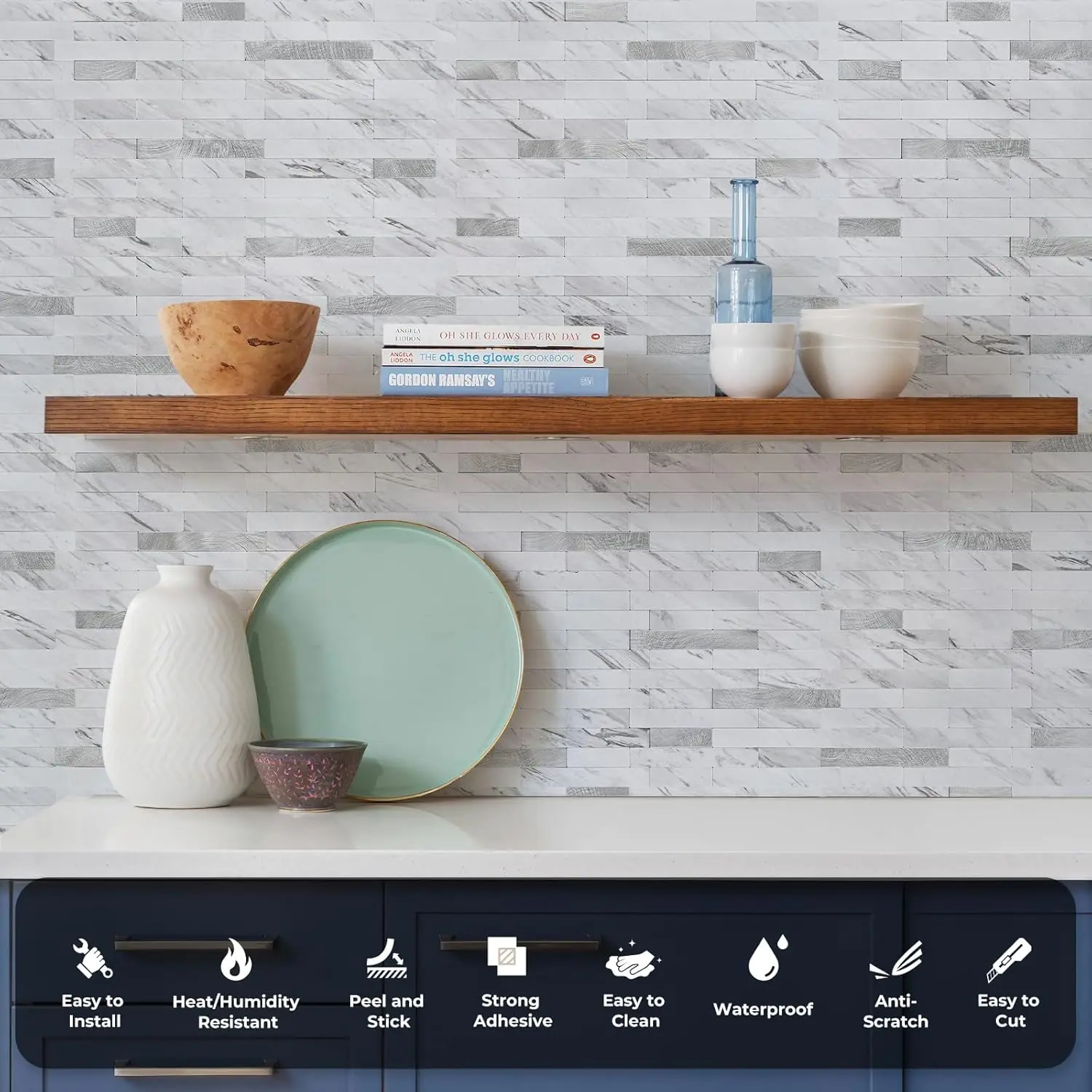 ·Premium Kitchen Backsplash: Made of PVC composite laminate, color fadeless, anti-scratch, easy to maintain, more stronger and durable than other ordinary vinyl backsplash tile.