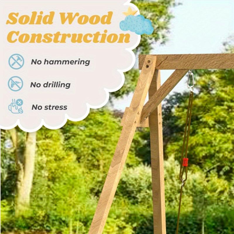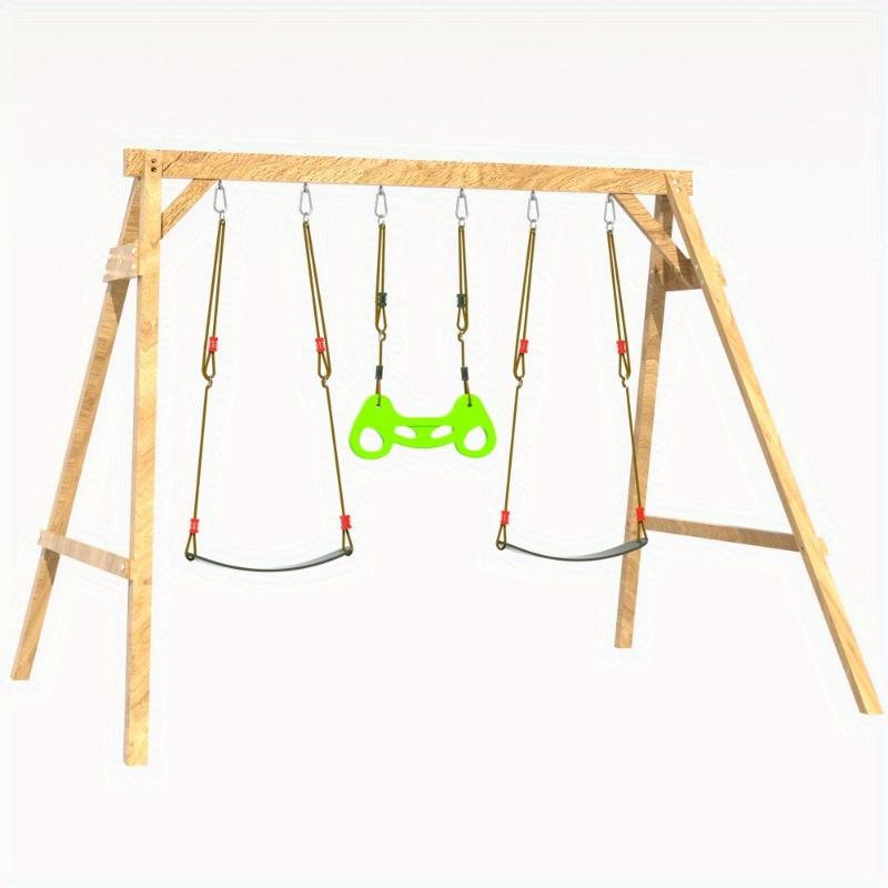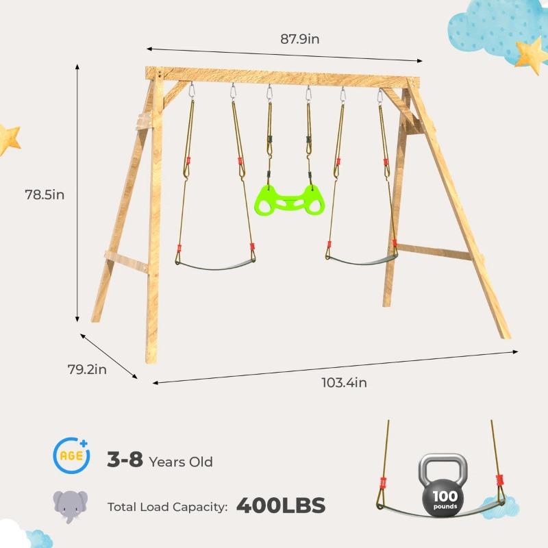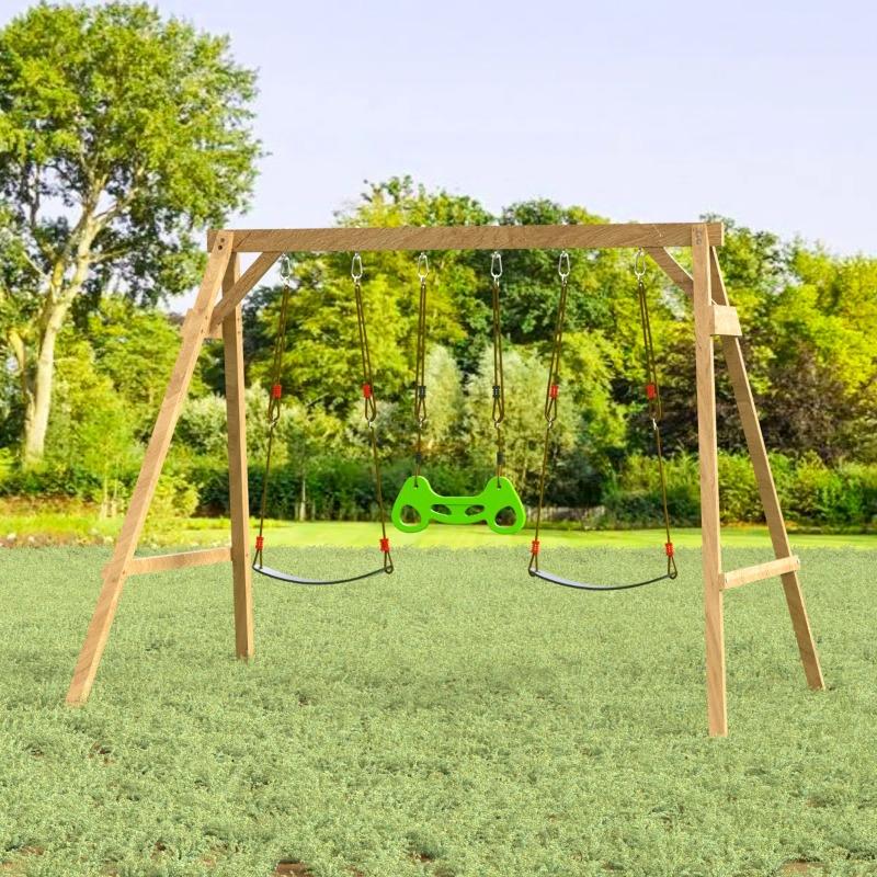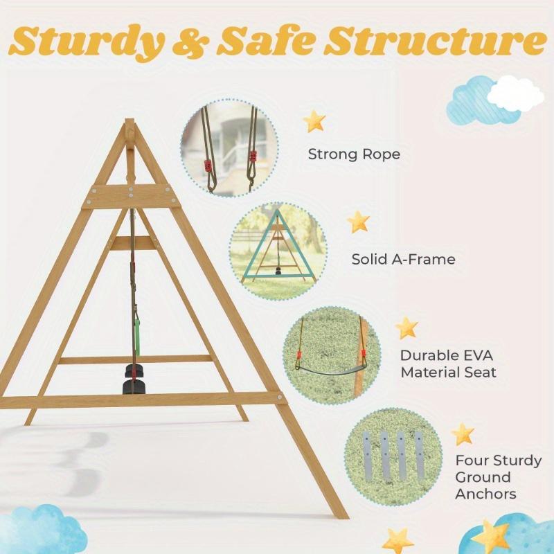 Durable and Safe ConstructionThis wooden swing set for the backyard is made of high-quality European spruce wood and is weather-resistant and paint-treated for durability. The set includes a ground anchor and a fixing pegboard for maximum stability, ensuring it is firmly held in place and ensuring the safety of children while playing.