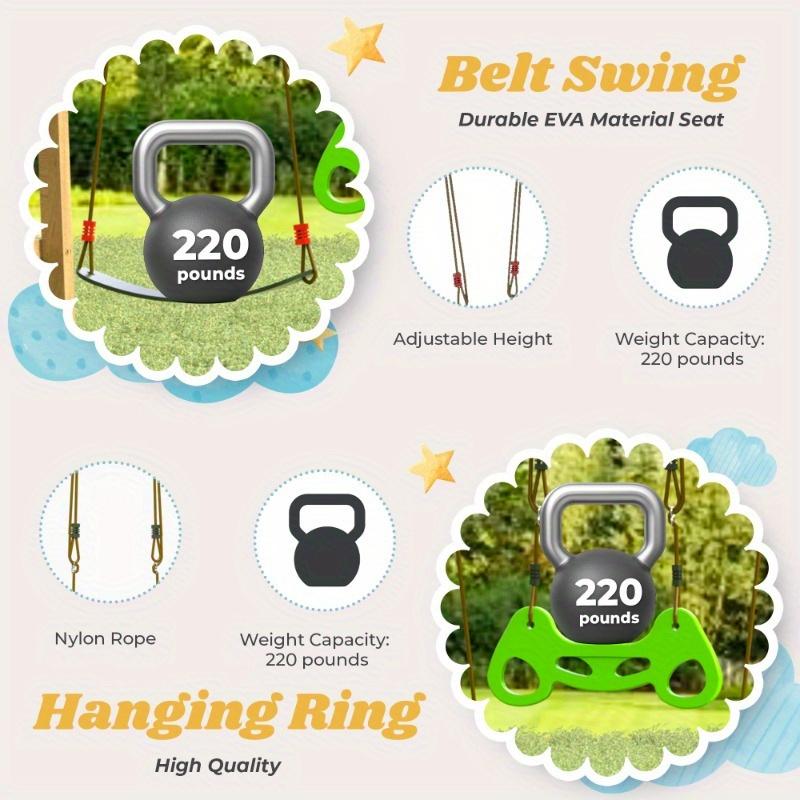 Create Unforgettable Childhood MemoriesThis backyard playground set with 2 EVA nylon rope swings and a hanging ring offers a variety of play options to let your children experience the outdoors and watch them grow in play, exploration and imagination.