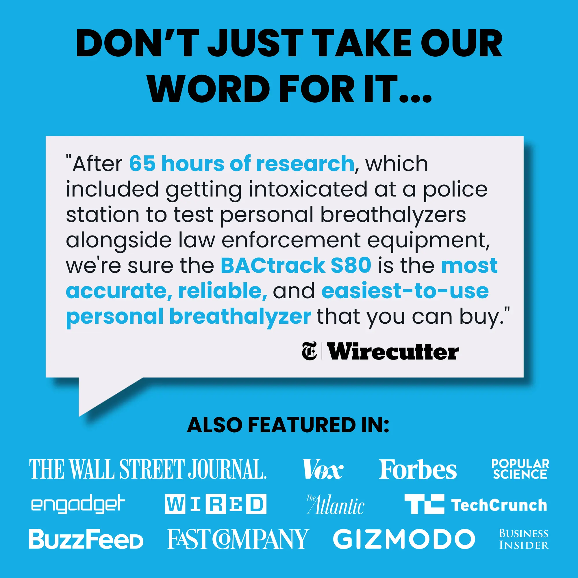 ·#1 RATED BREATHALYZER BY WIRECUTTER - "After 65 hours of research, which included getting intoxicated at a police station to test personal breathalyzers alongside law enforcement equipment, we're sure the BACtrack S80 is the most accurate, reliable, and easiest-to-use personal breathalyzer that you can buy." - TheWirecutter