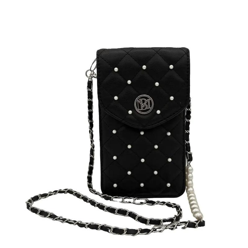 Elegant Design: The Badgley Mischka Phone Holder Wallet features an elegant quilted design and with pearl studding. The crossbody strap is braided with silver metal hardware.