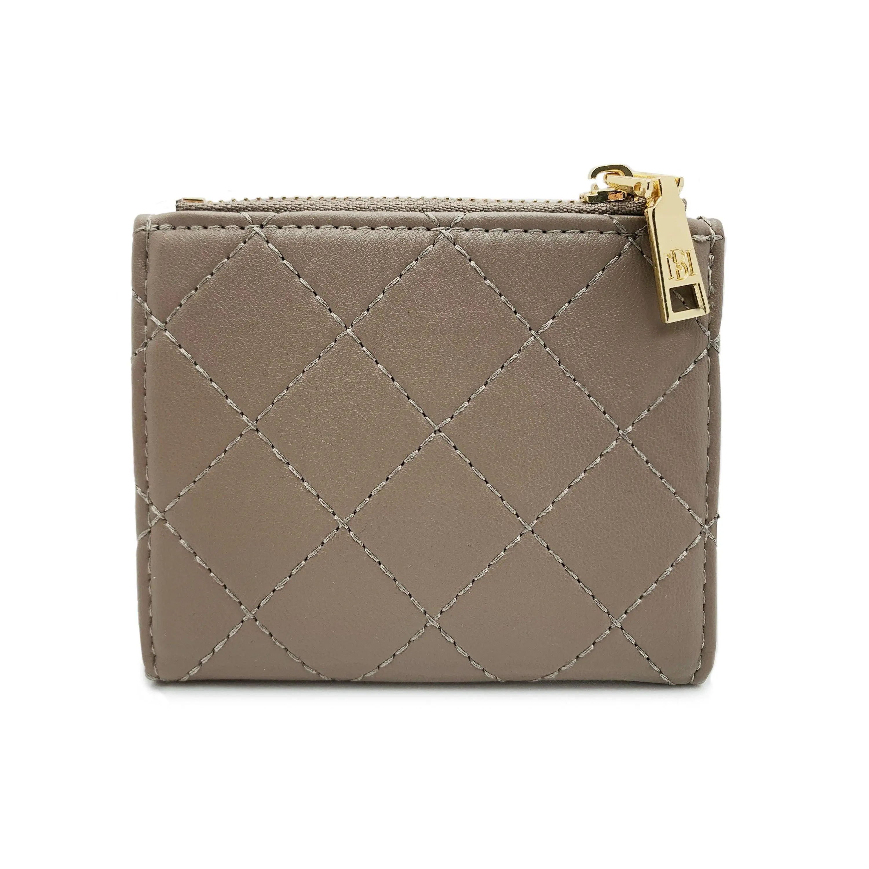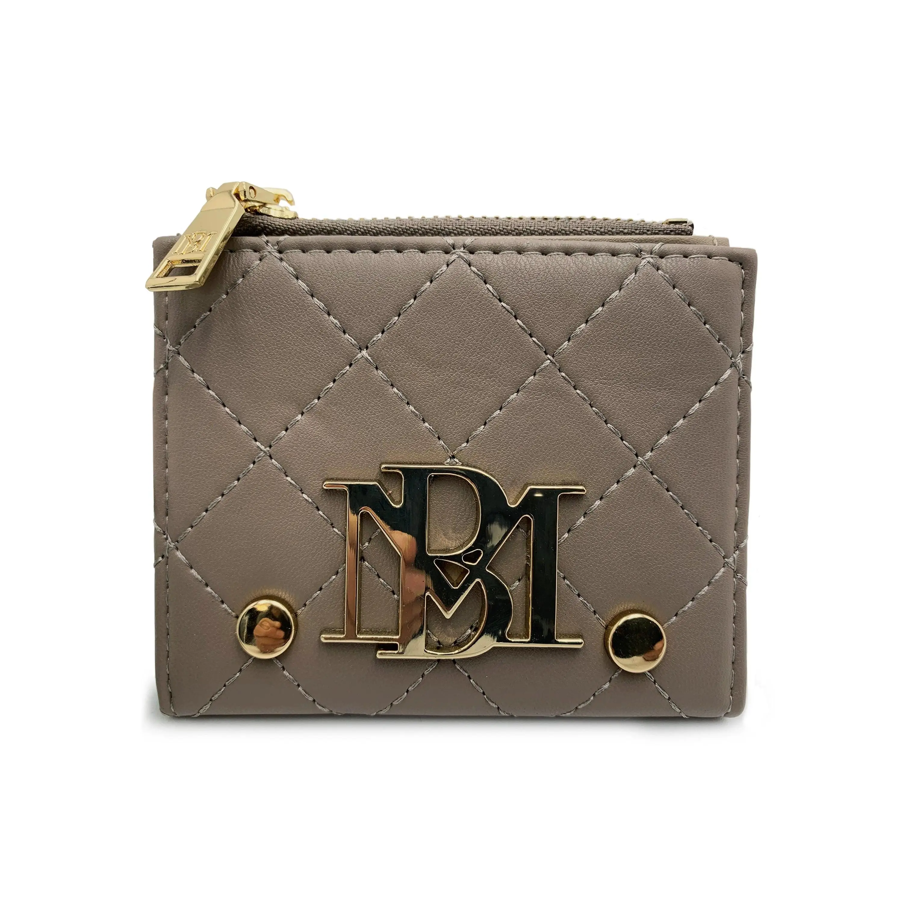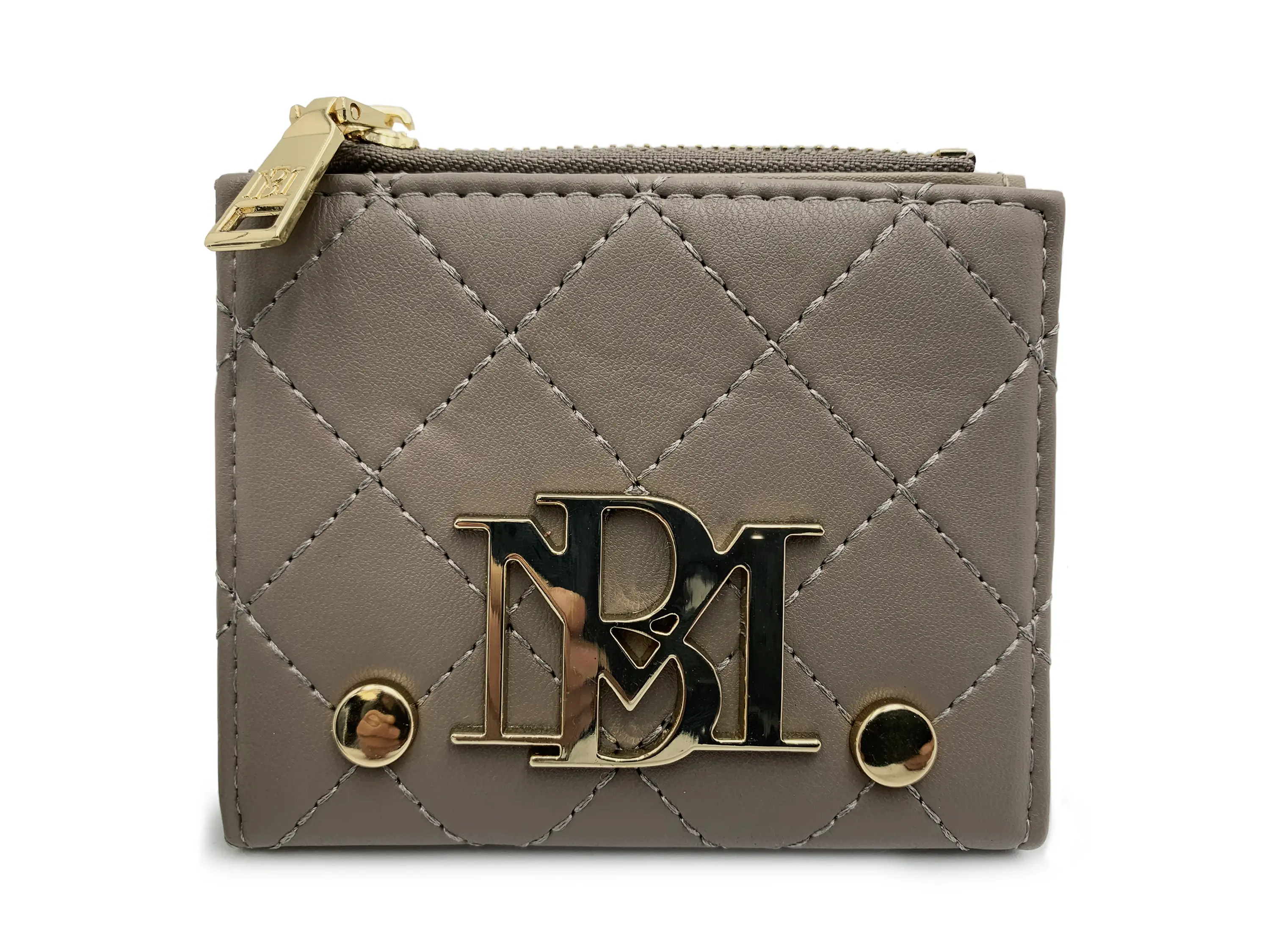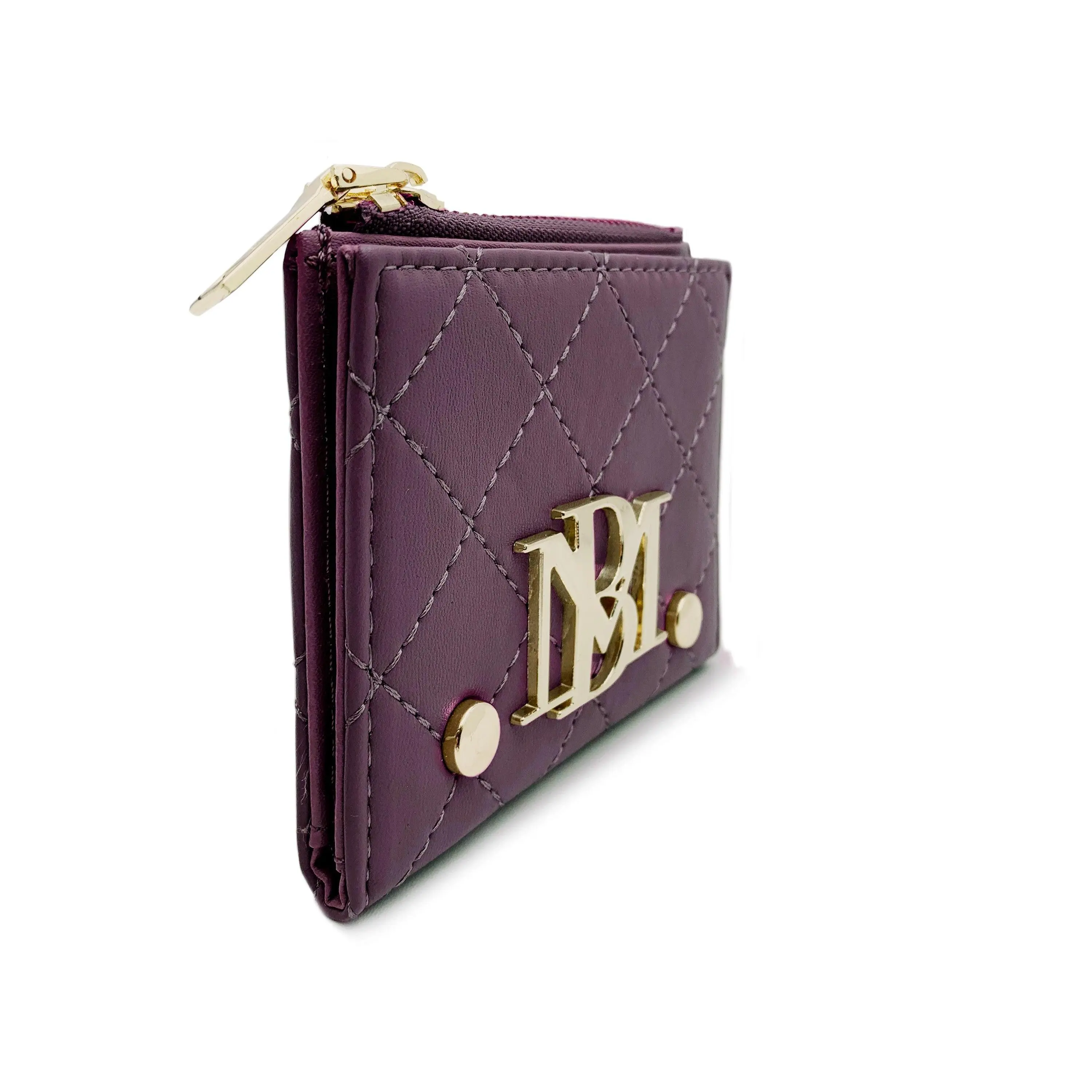 This wallet features a minimalist aesthetic with a Badgley Mischka logo in gold hardware and it comes in a variety of colors. It's perfect for everyday use, offering a stylish yet simple look. The design ensures you carry your essentials in a chic way.