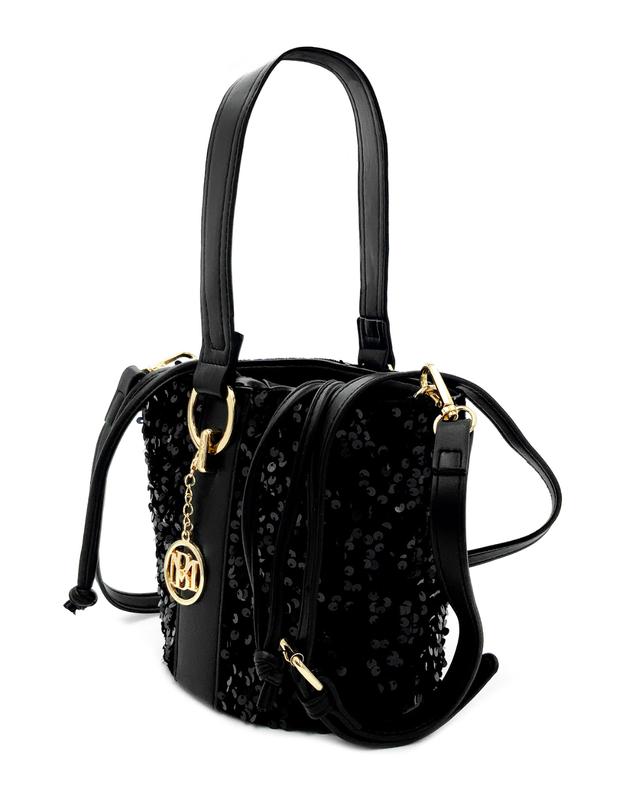 Chic small sequin bag blends everyday function with Badgley Mischka's signature elegance. Designed in a rich finish, it features a sequin texture, polished gold metallic accents, and a silhouette that’s both stylish and practical. Lightweight and easy to carry, it includes multiple zip compartments to keep your essentials organized on the go. Perfect for day outings, travel, or adding a refined touch to any casual look.