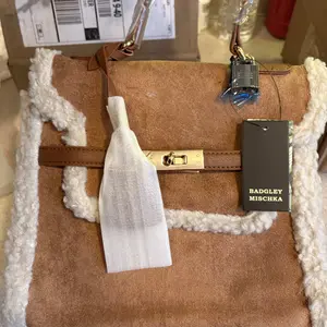 I love that it matches my shearling jacket but it doesn’t match the quality of other Badgley Mischka bags I have. I had to cut off a few stray threads and some excess fluff from the shearling.