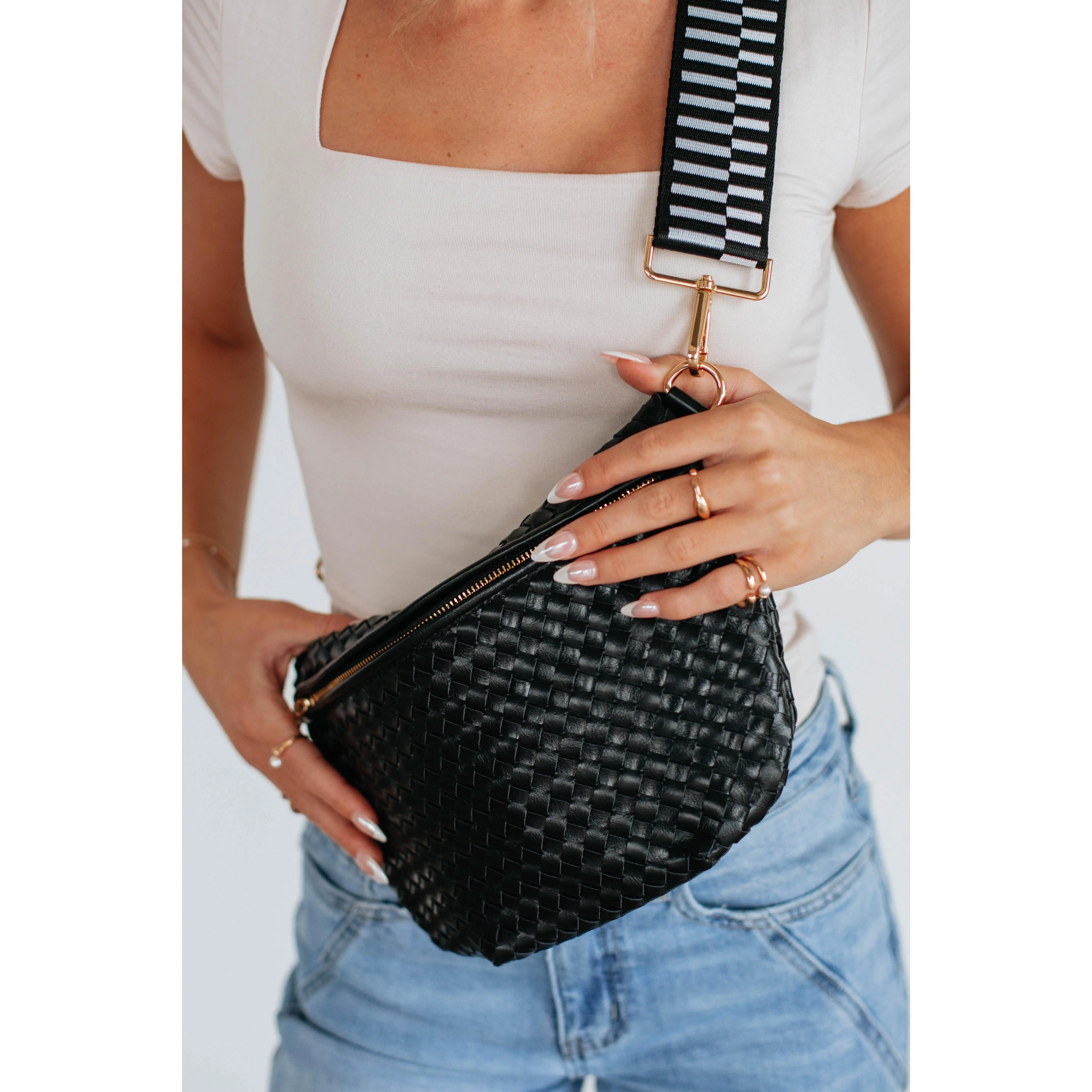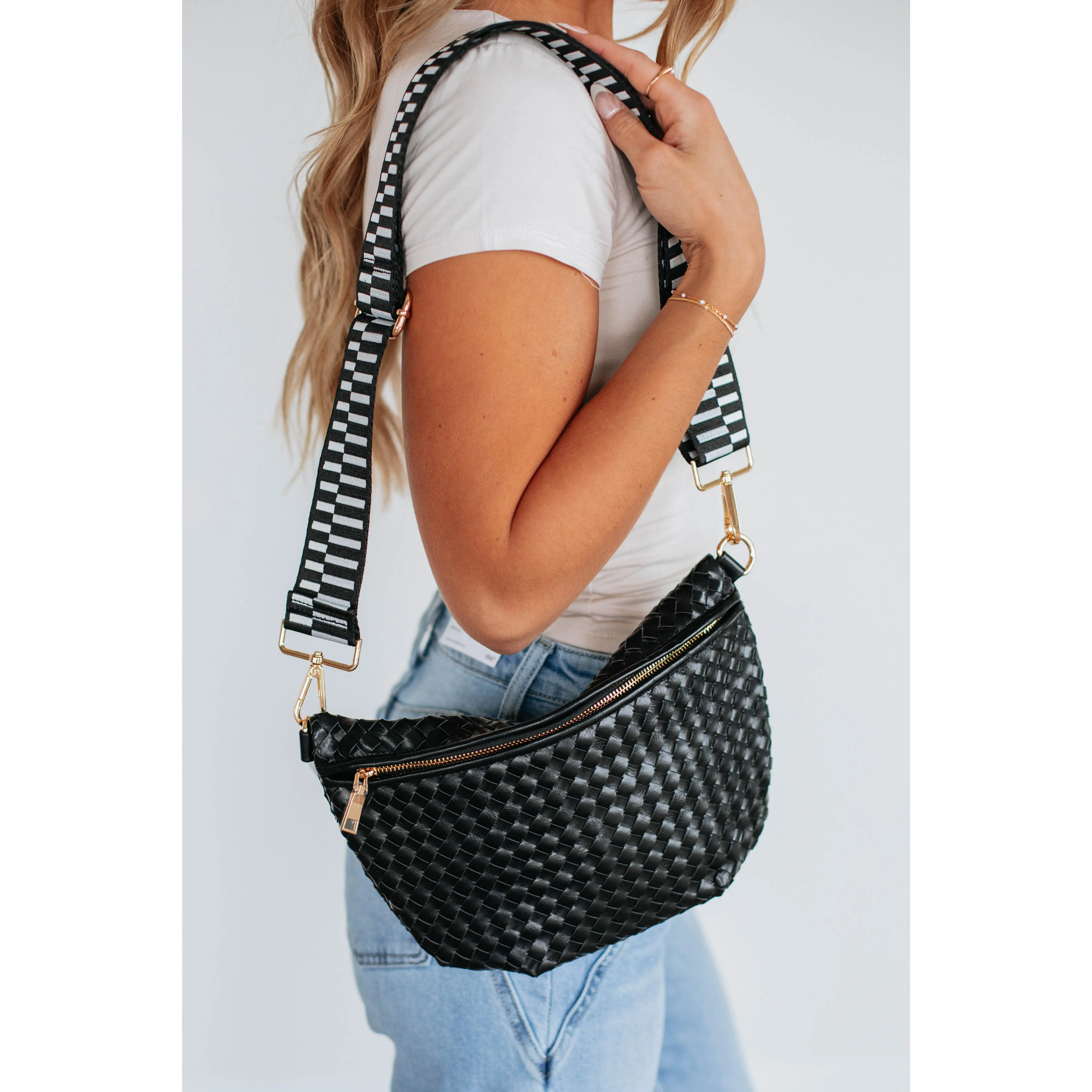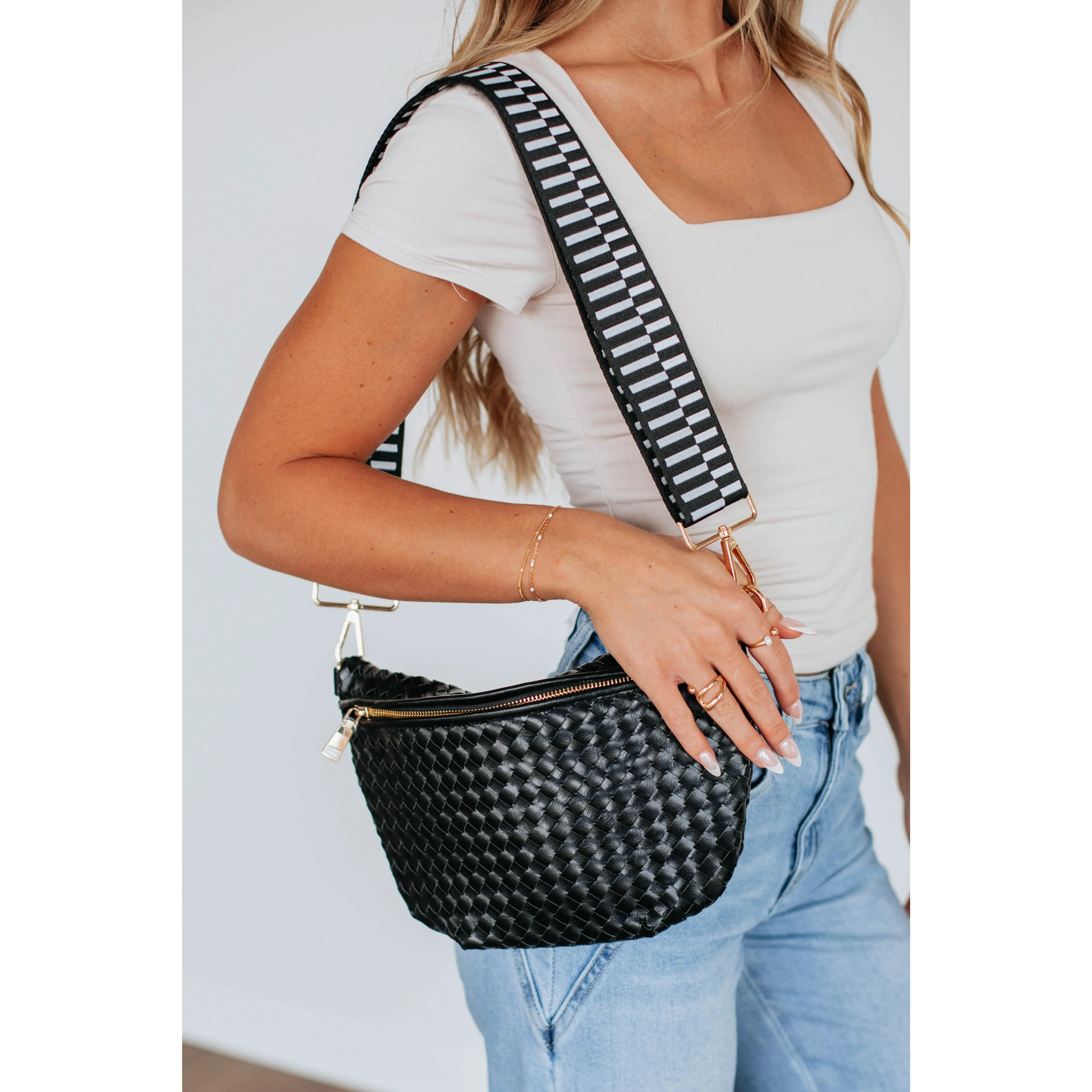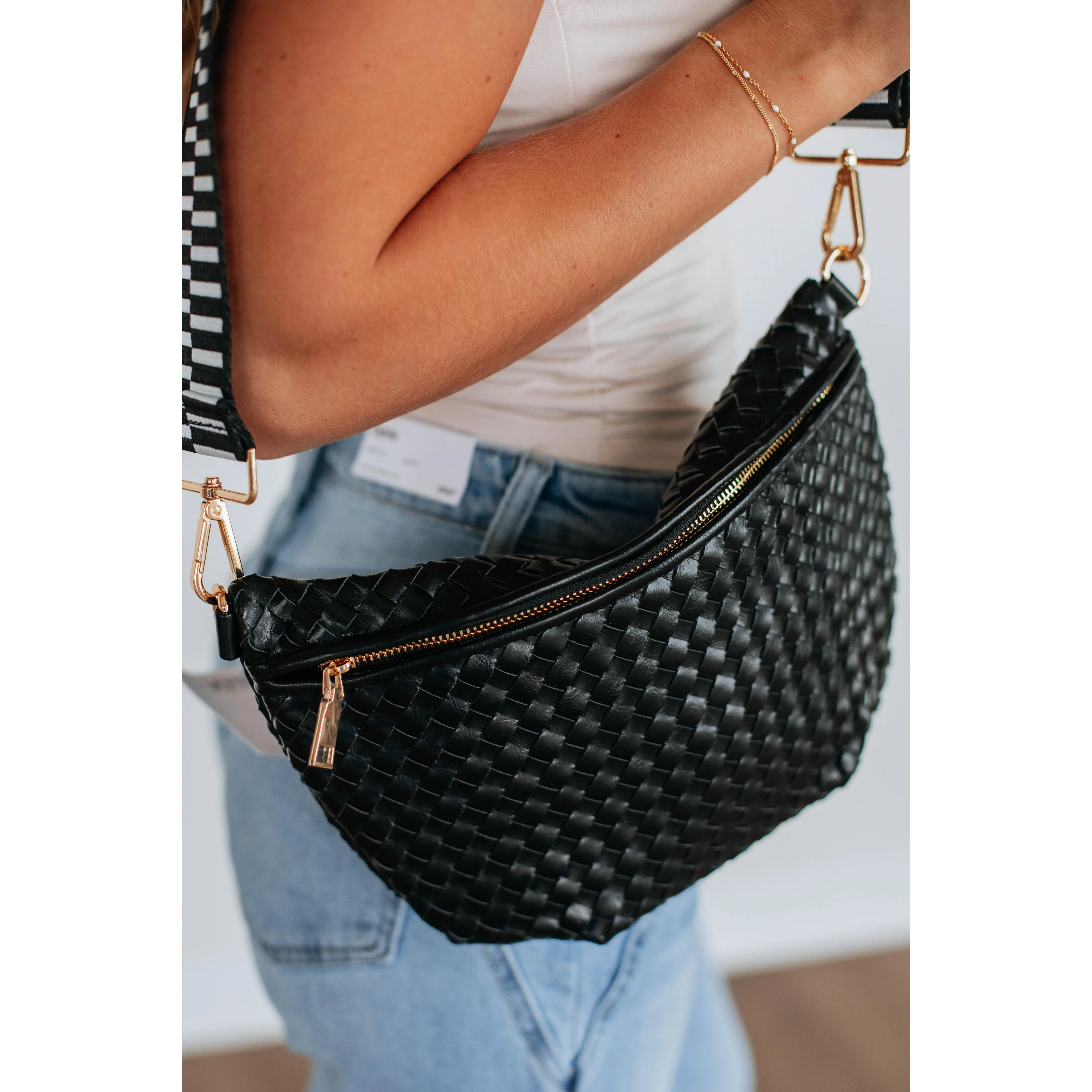 ·Exterior Details: Woven Detailing, Zippered Slash Pocket, Gold Hardware