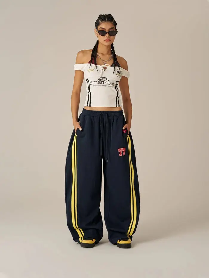 ·The baggy silhouette and side stripes add sporty charm—perfect for weekend coffee runs, park strolls, or laid-back errand days