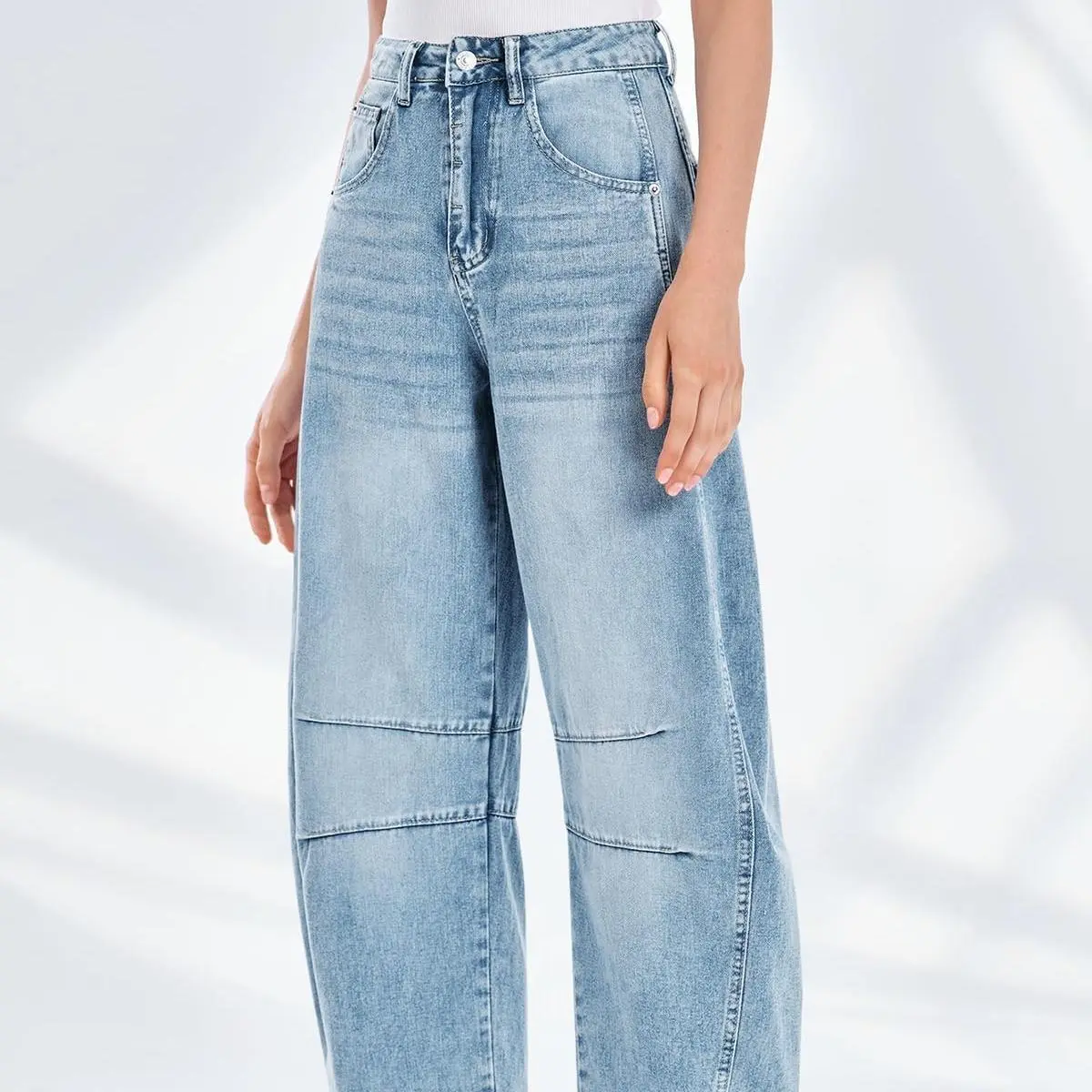 Design: Designed to fit loosely, mid-rise, slouchy, relaxed fit, wide-legs, ankle-length, zip-fly and button closure, 4-pocket style, subtle distressing, tapered bottom hem, seam detail throughout.